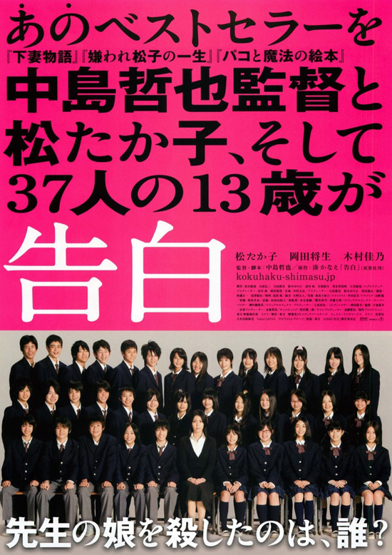 原作の小説は読んでいませんが、一気に書かれたものではなく、章立てで徐々に発表されたものだそうです。映画は、小説の第一章から最後の第六章までが描かれています。中学校の担任・森口(松たか子)が終業式後のホームルームで、自分の娘が死んだこと、それは事故ではなく殺されたこと、その犯人はクラスの中の二人であることを告白します。犯人のふたりの名前は出さないけれども、クラスメイトには誰かわかるような特徴を告げる。そして、その二人に対して森口の復讐が始まる・・・というストーリーです。