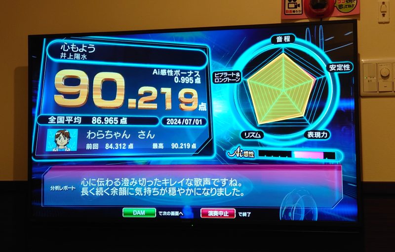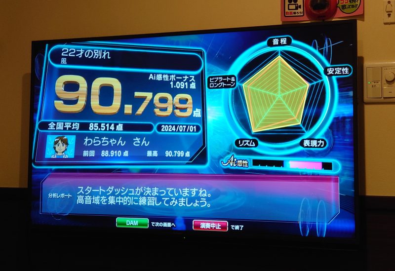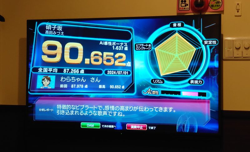 今日は、朝9時半から夕方6時まで奥さんとふたりでランチ付きカラオケ。奥さんは得意曲だけではなくて初めて歌う曲でもメロディが頭に入ってさえいれば90点台を乱発。声がしっかりしていて音程を外さなくてビブラートが異常に多いので当然といえば当然。私も声の出し方を参考にさせてもらったら、47曲中90点台が4曲といつもよりは好成績。楽しい8時間半でした。