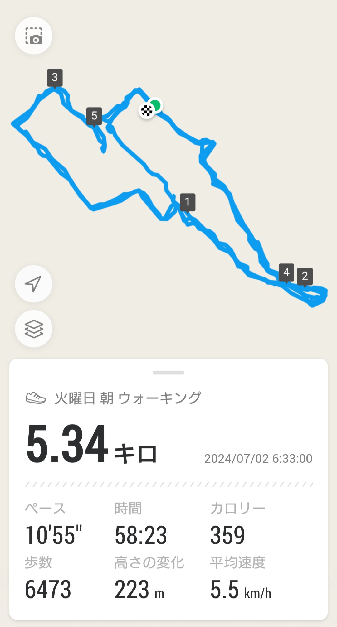朝の散歩と今日の空_20240702 運動の話 2024年7月2日(火) 9:112024年7月3日(水) 7:39 今日はもともとは終日雨予報だったのですが、一時雨程度に変わってきて、今朝、外に出た時は青空が広がっていました。今朝は調子が良くていくらでも歩けそうで、頭の中ではもう1周もう1周と思ってしまうのですが、毎日コツコツ続けることが大事なんだと思い直して、今朝は3周でとどめました。3周目になってくると雲が広がってきてその変化が面白かったので、比較写真を撮っておきました。ガソリン価格は1日で5円安。1日でこんなに変わるならば、このガソリンスタンドで昨日給油した人は損した感じでしょうね。