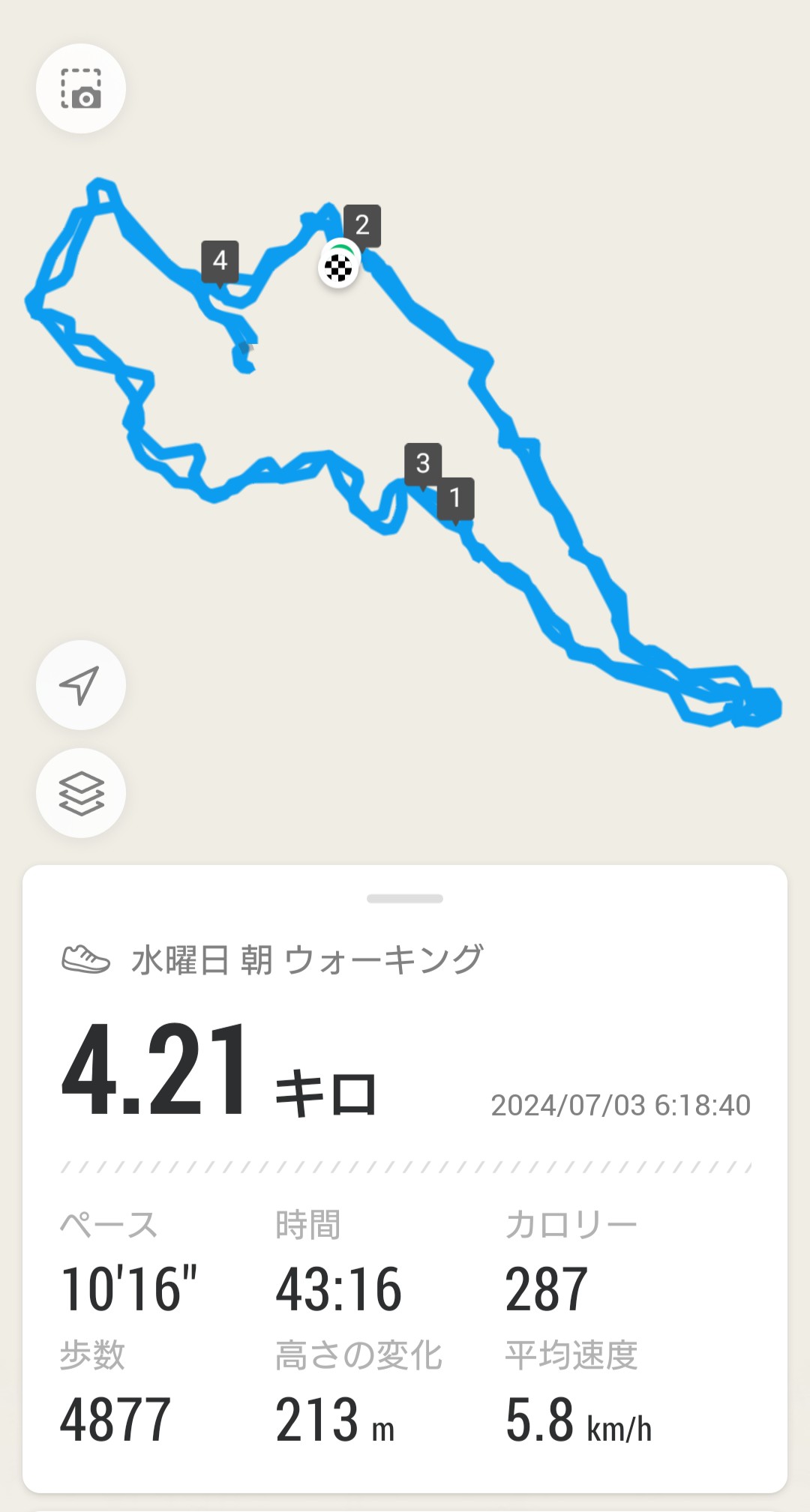 今朝は風が少し涼しいと感じる朝でした。今日もひとり散歩なので、一周2kmのコースを2周。どこにいても自宅から1km以内というのは、近所を歩いている感覚で距離を伸ばせるのがいいですね。散歩コースや歩く時間をいろいろ変えてきましたが、朝早く近所を歩くこのパターンが長続きしそうです。