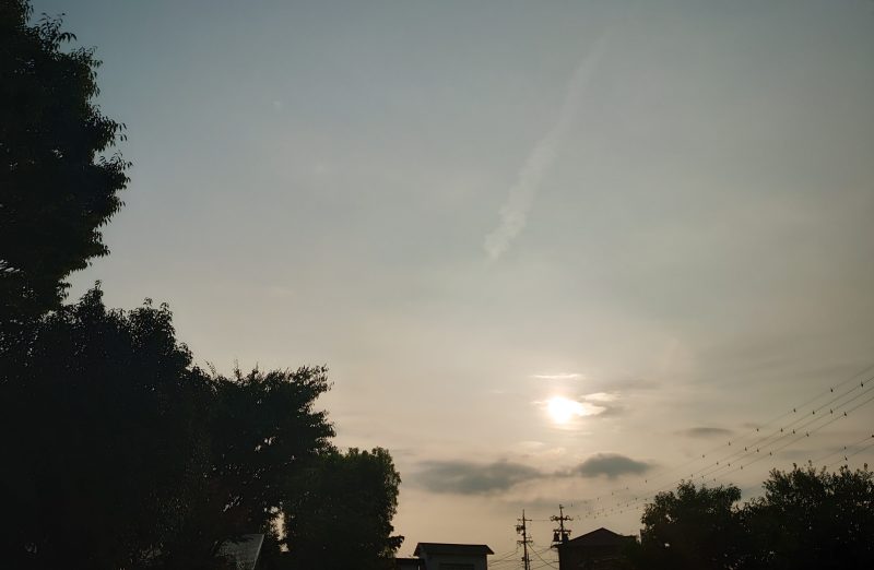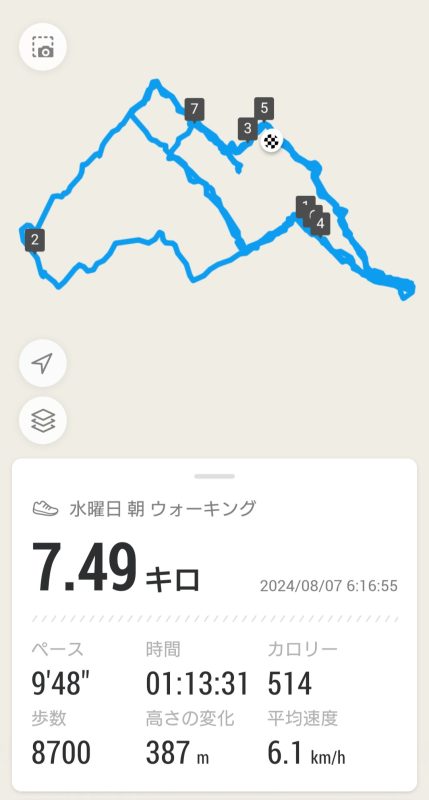 朝の散歩と今日の空_20240807 運動の話 2024年8月7日(水) 8:55 今日は立秋、暦上はもう秋で暑中から残暑となります。今朝は、すぐに汗が吹き出すこともなく多少爽やかな朝でした。体はすこぶる快調で、足は軽やかで呼吸も乱れることなく、久しぶりに時速6.1kmで歩くことができました。昨夜は早く寝て久しぶりに睡眠時間を7時間以上とった(いつもは4時間程度)のも良かったのかもしれません。蝉の声がだんだんと弱くなってきています。