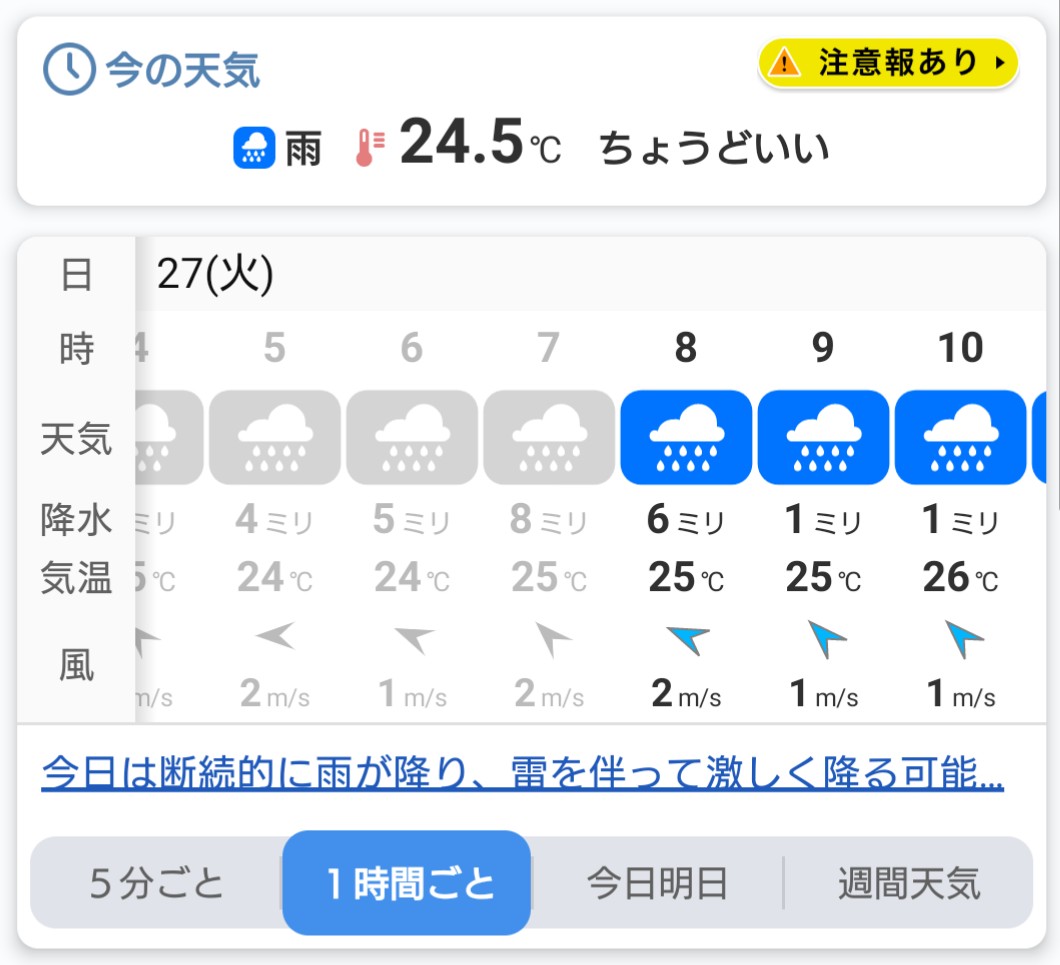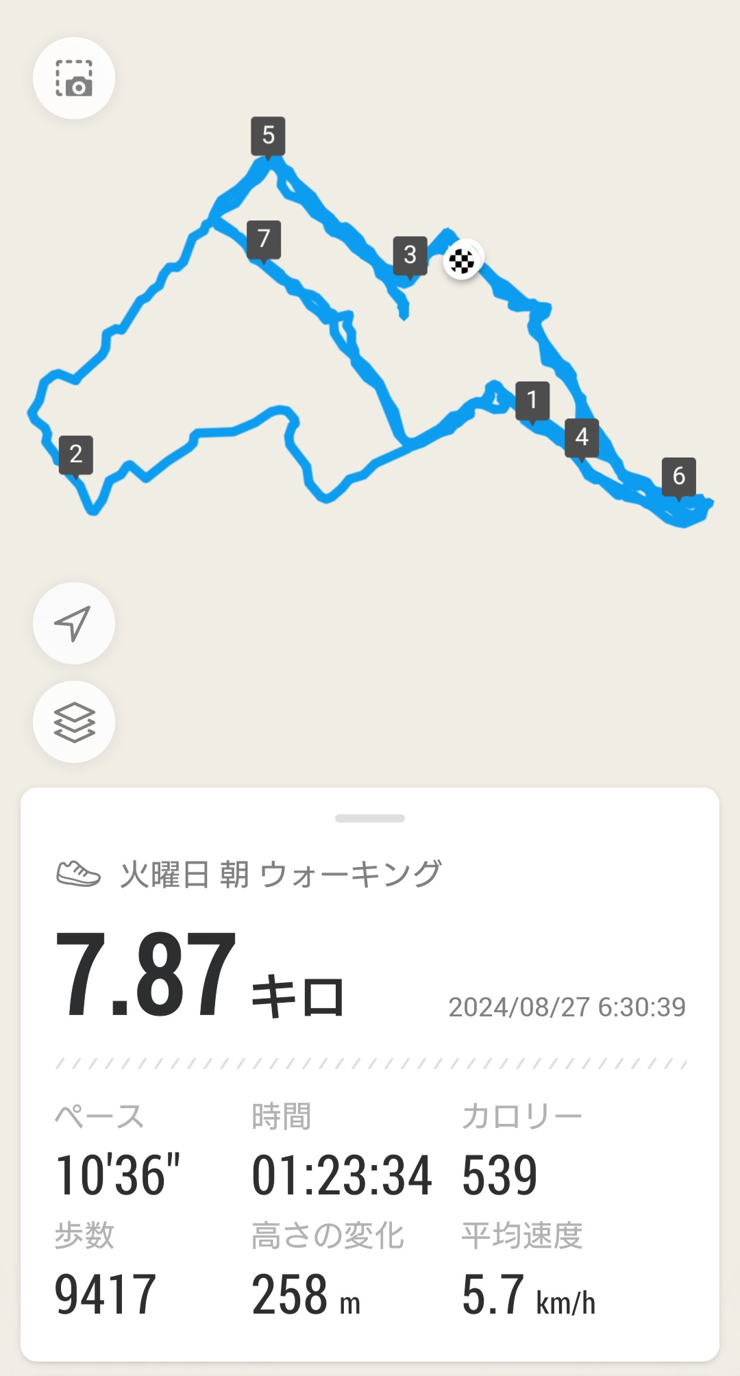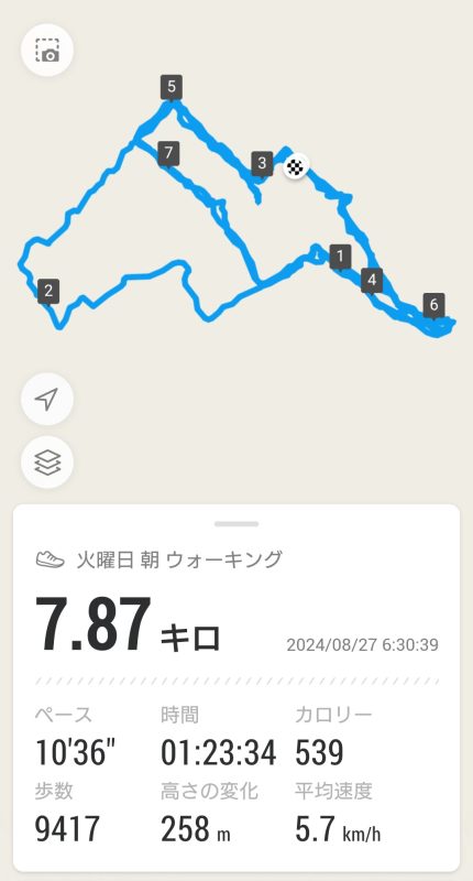 今朝は本降りの雨。風は無いので傘をさして歩くことに支障はありません。気温も高くはないのですが、体を動かしているとすぐに汗ばんできます。傘が前のめりになる傾向なので、汗と雨で背中がすぐにグショグショになってしまいます。体力的には7kmくらい歩いても体の疲れや負担はまったくないのですが、最近は歩き始めるエネルギー、歩き続けたいというエネルギーが弱くなっているように思います。このままでは体は良くてもメンタル的に苦行になってしまいそうなので、そうなっている理由を探し出さないとダメですねぇ。