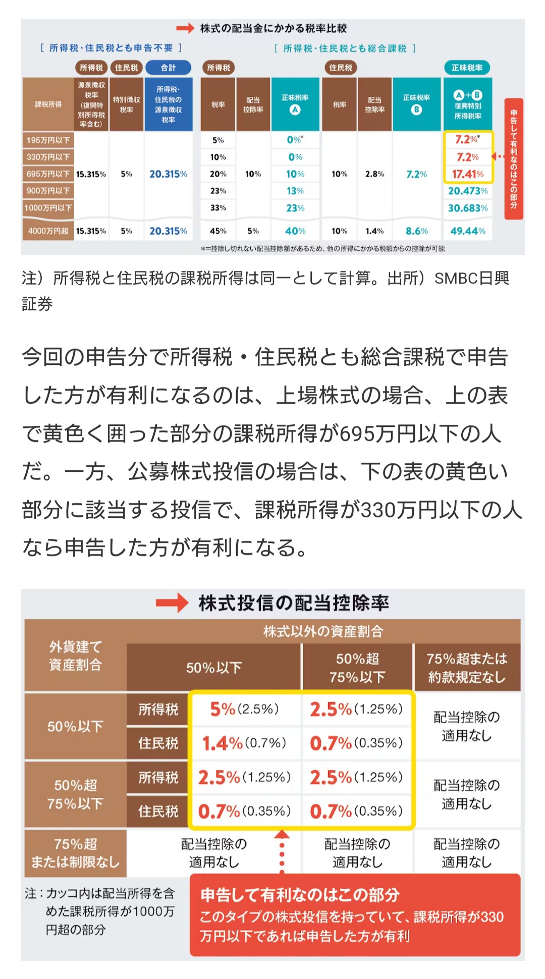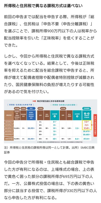 今までの給与収入の所得課税率だと、金融所得は分離課税で約20%の税金を払って、全体所得としては含めないほうが得でしたが、年金生活となった今後はどうなんでしょうね。総合課税にしたほうが所得税率は低くなるので金融所得の所得税は少なくなりますし配当控除が認められますので課税所得額が減りますが、金融所得が全体所得に含まれるので、所得が増えることにより健康保険料や住民税は高くなります。その差がどのくらいなのか、きちんと試算しておいたほうがよさそうです。年金所得だけの人は、一般的にはどうしているのでしょうかねぇ。金融所得課税も累進課税になるとこういう悩みも少しは軽減されるのでしょうけどねぇ。