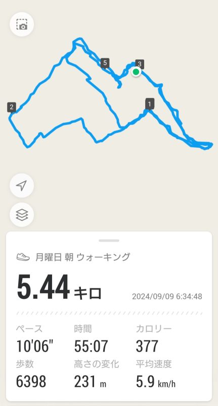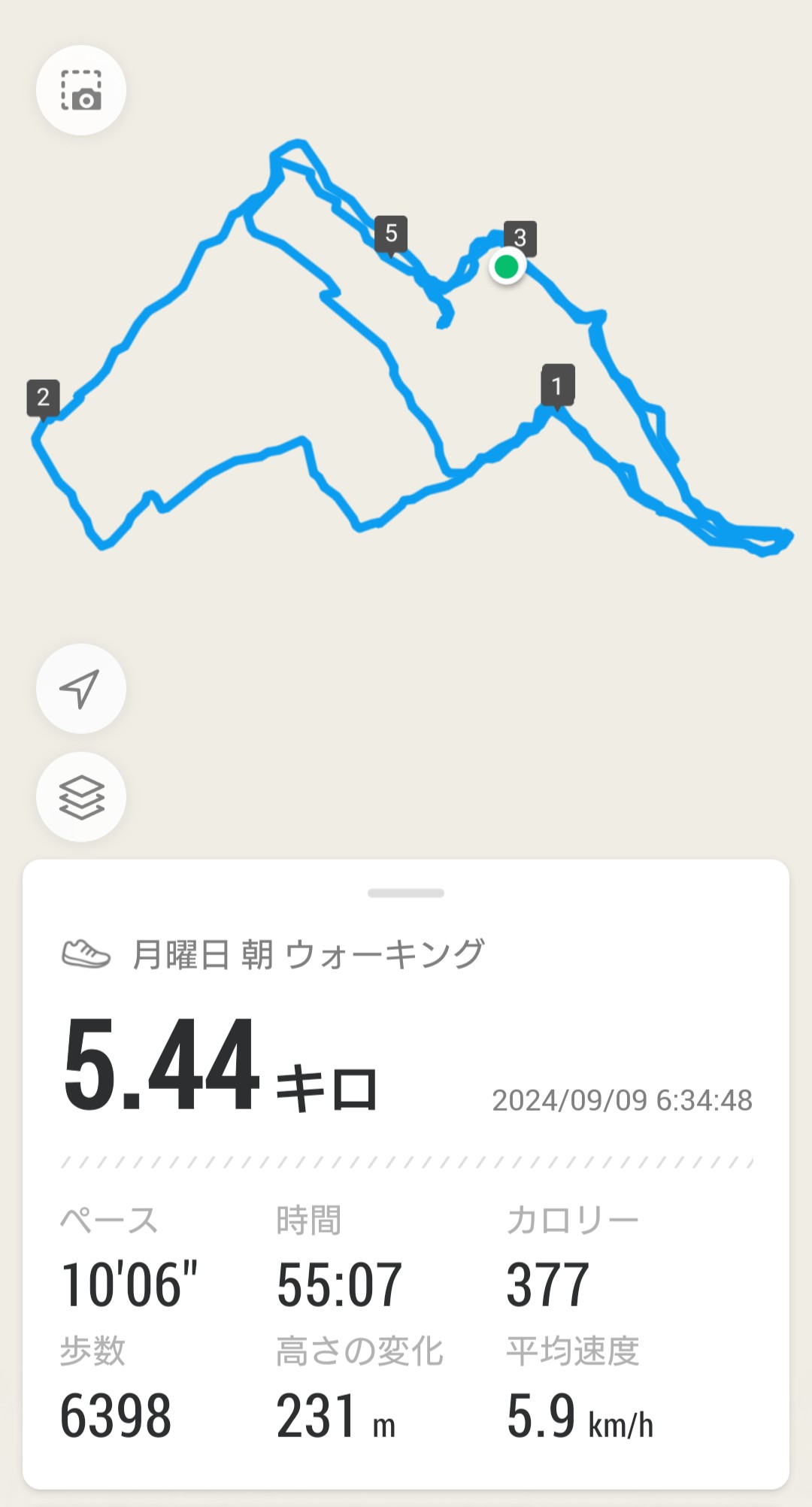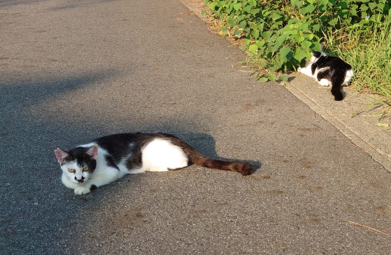 朝の散歩と今日の空_20240909 運動の話 2024年9月9日(月) 8:55 少しは涼しくなりましたが、まだまだ暑い朝です。散歩はここ数日休息日にしていましたが、メンタルと足の疲れが少し癒されましたので再開です。ただ、距離は無理せず5km程度に抑えることにします。5kmだと効果的にも満足感的にも物足りない感じはしますが、疲れがたまるのは本末転倒なので、腹八分目と同じく物足りない感じが一番いいのかもしれません。今朝のニャンコたちは2匹に出会うことができました。