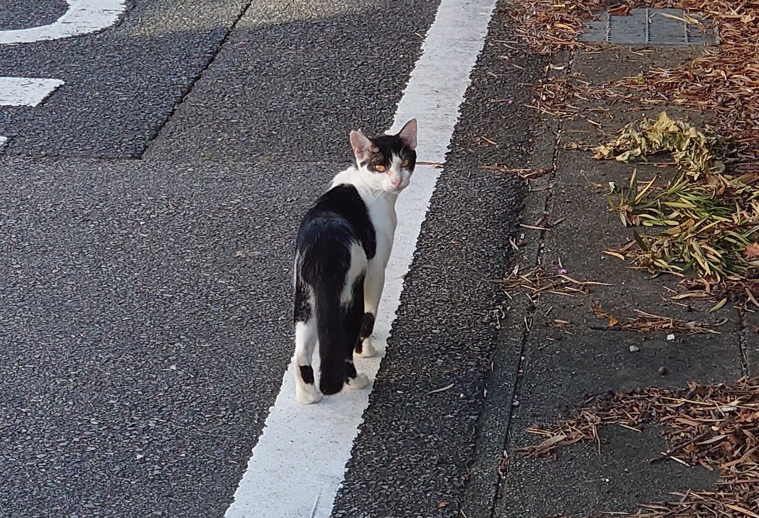 今朝はまた寝坊をしてしまい、起きたら7時になろうという時刻でした。体も重くて今日はまた休息日にしようと本気で思いましたが、そんなことばかり思ってしまう自分もいやだなぁと思って重い体を動かして歩き始めました。体が重いだけではなく、曇り空との予報だったのにすでに日が差しているもの気分を削ぎます。歩き始めて2.5kmくらいは、体が重いだけではなく呼吸も少し苦しくて、何か病気かなと思ってしまいそうな状況でした。3kmを過ぎる頃からやっといくら歩いても疲れないという感じになってきましたが、今より6kg以上重い体の時のほうが快調に歩いていたというのも皮肉なものです。もう少し歩こうかなと思いましたが、小学生が歩道に多くなってきましたので、今日は無理せずに5kmで今日も終わって継続を重視していきましょう。ニャンコは出会ったのは一匹だけ。しかも顔見るとすぐに逃げてしまいました。写真は逃げる前と塀の中に逃げていった同じニャンコの写真です。