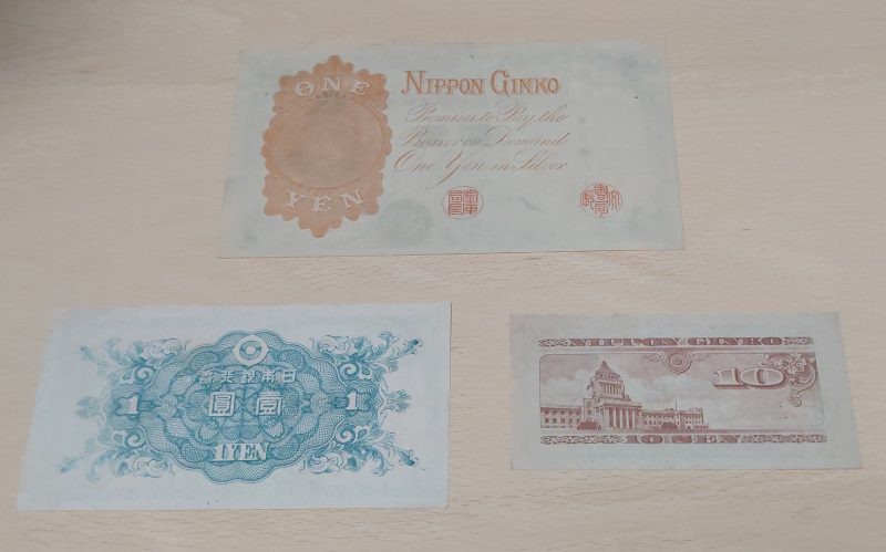 部屋の片付けをしていたら、亡くなった母が結婚前に働いていた時の給料袋が出てきました。遺品整理していた時に資料と一緒に持ってきていたようです。中を見ると、一円の日本銀行兌換銀券(武内宿禰)、一円の日本銀行券(二宮尊徳)、十銭の日本銀行券(A号券)が入っていました。一円のは今でも一円として使えるようです。また、一円の日本銀行兌換銀券が大黒天の旧券ならば、万円単位で取引されているようですが、この3枚は数が出回っているようで、数百円でもなかなか取引できない程度の価値しか無いようです。コレクションとしては面白そうです。