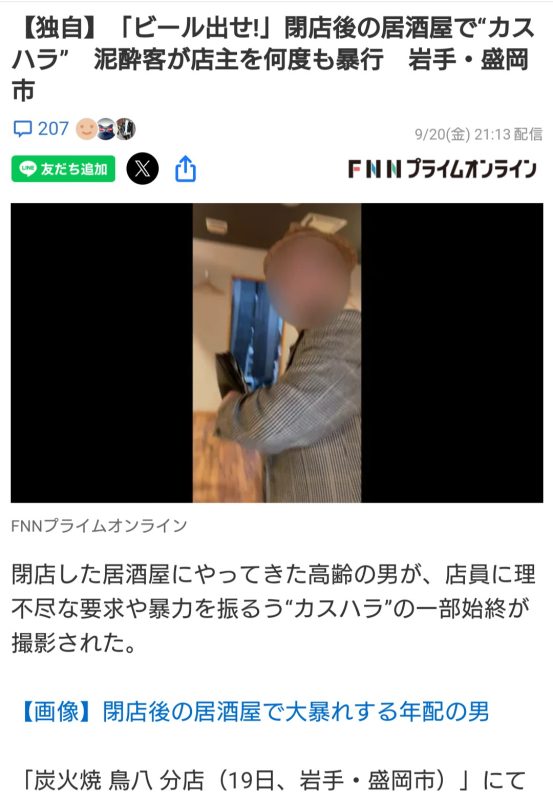 被害にあった居酒屋の店主は、この泥酔客と酔いが覚めたあとに警察で会ったそうですが、動画を見せられると不機嫌になり、「酔っ払っていて覚えていない」「じゃあ、どうすればいいんだ」と真摯に謝ることなく開き直ったそうです。「酔っ払っているときのことは仕方がないとか許される」とか思っている人はしらふでも非常識な人間なのだから、人前で酒など絶対に飲まないでほしいものです。人に迷惑や損害を与えるのが目に見えています。お酒は、常識があって自分を制御できる人に品性を持って楽しんで欲しいと思います。覚えてないなら、飲むな!です。酔っ払いに苦労した私の個人的な意見です。