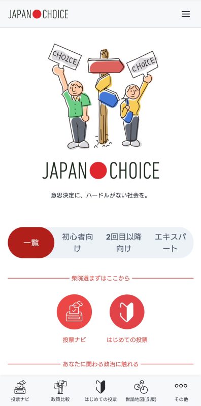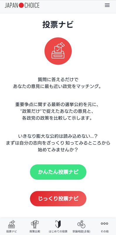 そろそろ期日前投票に行こうと思っていますが、その前に「JAPAN CHOICE」で自分の考えと投票予定の政党が合っているかを参考として確認してみました。「かんたん投票ナビ」と「じっくり投票ナビ」を両方してみました。「じっくり投票ナビ」は質問数が多いので、どれを重点政策にするかによっても結果は変わってくるようです。