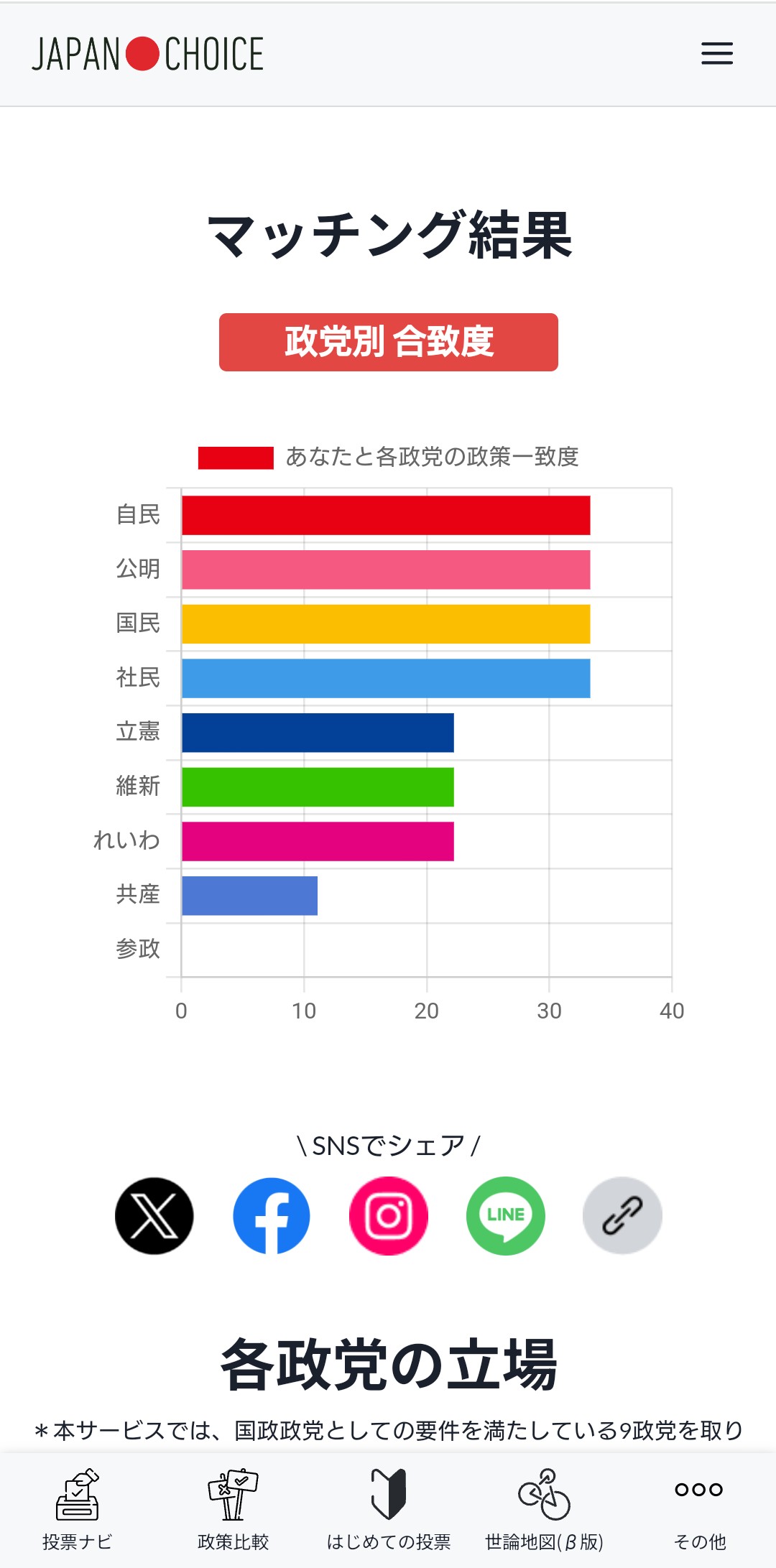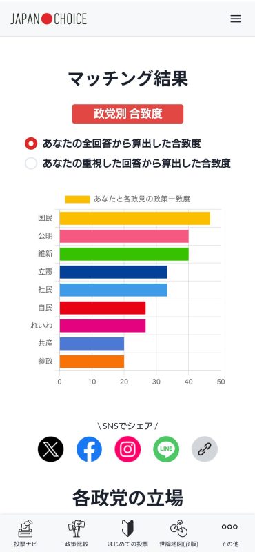 日記/出来事そろそろ期日前投票に行こうと思っていますが、その前に「JAPAN CHOICE」で自分の考えと投票予定の政党が合っているかを参考として確認してみました。「かんたん投票ナビ」と「じっくり投票ナビ」を両方してみました。「じっくり投票ナビ」は質問数が多いので、どれを重点政策にするかによっても結果は変わってくるようです。