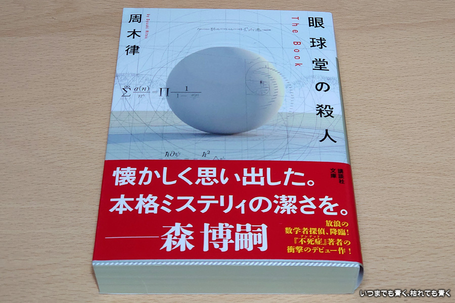 350ページを超える長編なので、一気に読み進めるのは難しいですが、場所が眼球堂だけであることと、時間の流れが明確なので話がややこしくなることはありません。時折、理解できない数学的な会話が入りますが、それを適当に流せば読みやすくて引き込まれる面白い作品でした。物語は藍子を中心に客観的に展開されます。読みながら犯人を自分なりに想像するのですが、藍子の「真実」という言葉に続く文章が意味深なのと、たまに不思議な心の動きが表現されているので、犯人は藍子ではないかと思いながら読み進めるのですが、藍子が犯人ならばどうしても説明できないことも多く、断定するまでにはいきません。そして最後は、眼球堂の仕掛けにによって、すべて驫木の犯行だったということが理論的に明らかにされて物語は終わり、藍子に対する違和感は逆の意味でのひっかけだったのかと騙された感を感じます。しかし、実は読者(私)が読んでいたこの物語は、事件が起きていた時のリアルな描写ではなくて、事件後に藍子が書いたノンフィクション小説だったということで、やられたという驚きと二度目の騙された感を感じます。そして、その小説について十和田と藍子が話をするという場面で、すべての真実が明かされてるという、そういう面白い構成でした。