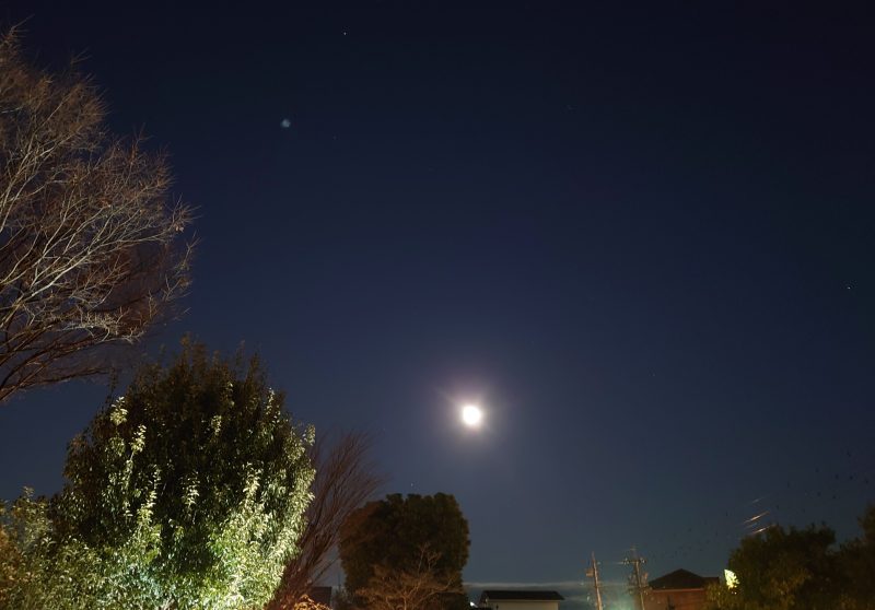 暗くなってきてから、甘いものが欲しくなったので1.5kmくらい離れたスーパーに行こうと思ったのですが、今日は朝の散歩をやめたので、夕方の散歩をしようと思って歩いて出かけました。外に出ると美しい月。明日の朝が完全な満月なので、今夜もほぼ満月といっていいまんまるの月です。新年最初の満月、ウルフムーンです。スーパーでは、大好きなオレンジの炭酸のペットボトル3本も買って(70円台で安いのです)、その重い袋を持って遠回り、遠回りして、結局8km歩いてしまいました。防寒具を着て出かけたのですが、途中で脱いで腕を捲り上げてしまうほど、身体はポカポカとして汗をかいてしまうほどでした。夜の散歩は久しぶりでしたが、月を見ながら歩くのも気持ち良くて風情がありました。