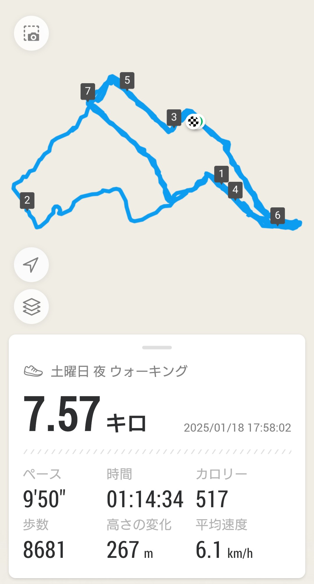 今日も朝の散歩ができなかったので、夜の散歩をすることにしました。歩き始めた時の気温は7度、日光の有無の差か、気持ち的なものかはわかりませんが、朝よりは気温が高いのに、寒さは朝よりもきつく感じます。今の気候だと、体に負荷をかけて歩いても、脇の下とお尻あたりに少し汗をかく程度なのですが、今日は2周目(4km付近)で背中に嫌な感じの汗を感じて、足が前に軽快に出せなくなってしまいました。これはもう家に戻るべきかと思いましたが、ゆっくりと歩き続けたら5kmあたりからいつもの「いつまでも