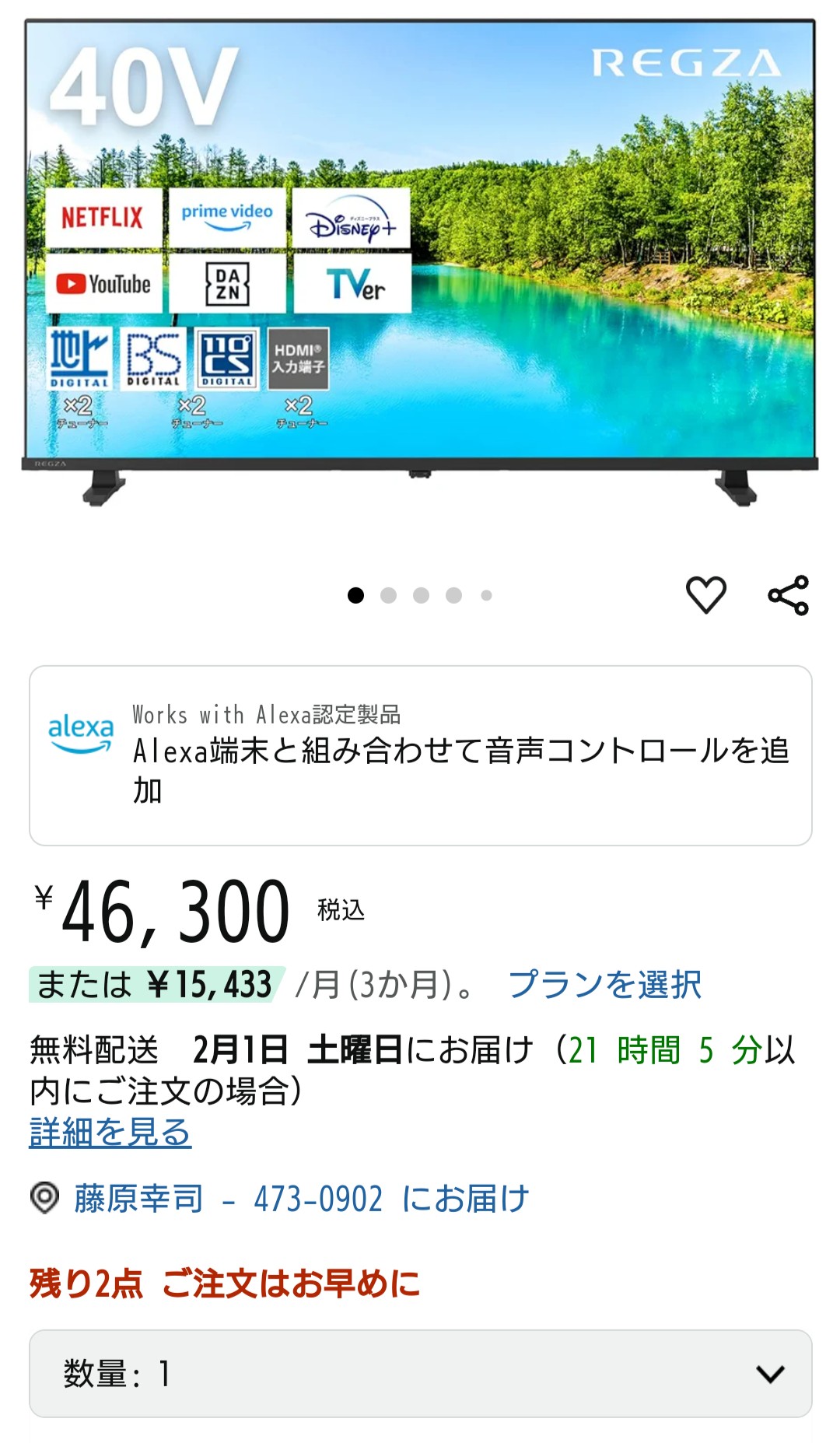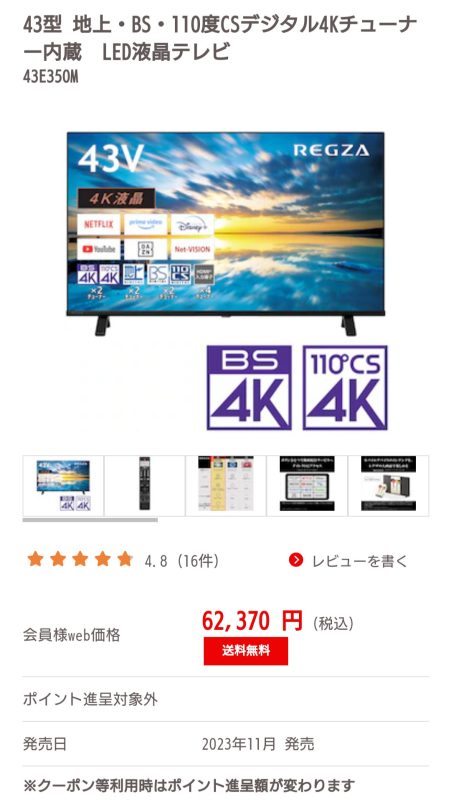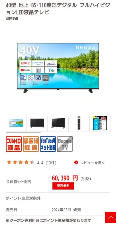買ったテレビの価格… 買物の話 2025年1月30日(木) 23:43 先週買ったテレビですが、先週は40,000円ちょっとで買えたのですが、Amazonの同じショップは46,300円に、Joshin webにいたっては47,000円くらいだったのが60,390円に上がっています。この1週間で何が起きたのでしょう?人気商品で在庫が少くなって価値が上がった?(んなわけ無い無い)ジョーシンは43型4K対応テレビとあまり変わらなくなっていましました。値段がコロコロ変わるのは買う側からするとあまり良いことではないですねぇ。