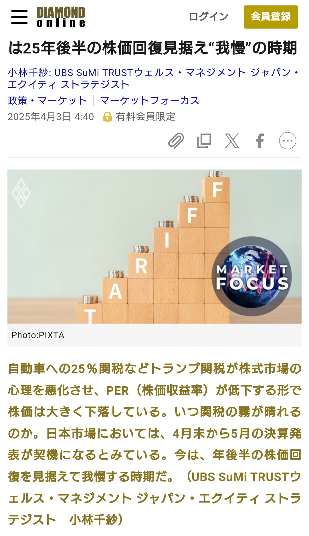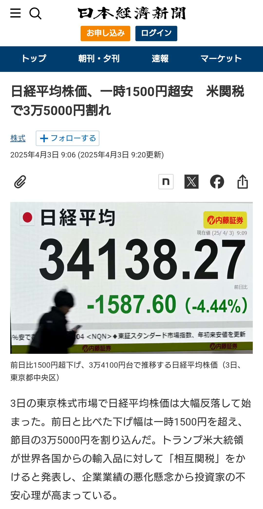 トランプ関税ショック お金の話 2025年4月3日(木) 10:10 少し落ち着いてきましたが、一時1,600円下落ってすごいことです。北米市場は昨日は少し戻しましたが、今日はどうなるのか。一喜一憂はしませんが、しばらくはトランプ関税ショックは続きそうです。やれやれ。