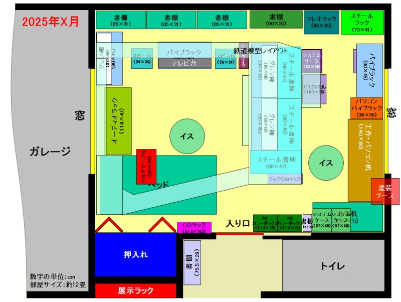 部屋の模様替え、現在の家具の移動影響を考えながら、変更案を作成。メリットは、オーディオスペースの拡張、テレビの目線高さ化、サラウンドスピーカ配置、ベッド配置等。デメリットは収納スペースの減少、鉄道模型レイアウトの若干の縮小。今週末に孫たちにドクターイエローの走行を見せたあと、鉄道模型はいったん撤収。並行して、収集しているだけでほとんど見ない雑誌・書籍やビデオ等の大幅廃棄、そのあと、徐々に家具を移動していくという段取り。出来上がりの快適さを頭に描いてモチベーションを維持させていきます。完成は8月を目標に。