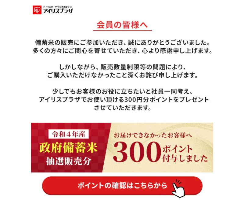 アイリスプラザからのお詫び 日記/出来事 2025年6月5日(木) 23:582025年6月6日(金) 21:13 アイリスプラザで備蓄米抽選に何度もはずれたからお詫びに300ポイントくれるって涙がチョチョギレます。それだけ備蓄米販売は利益があるんですねぇ。