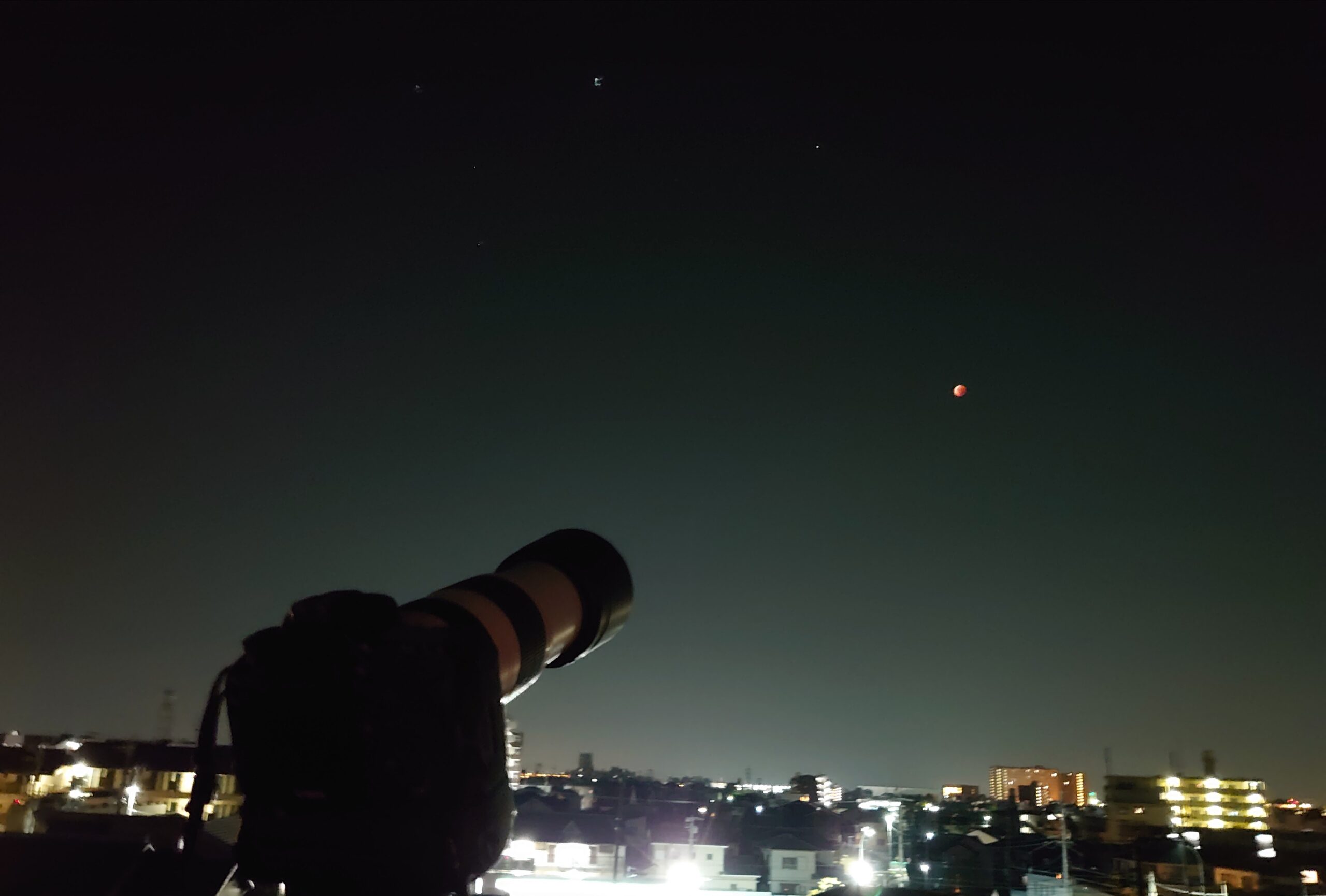 皆既月蝕撮影もあと少し。屋上は涼しくて寒いくらいの夜、いや夜明け前です。