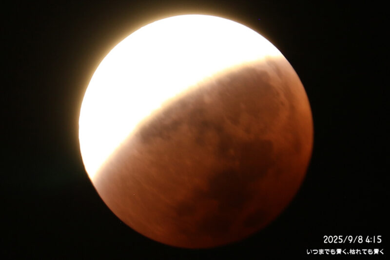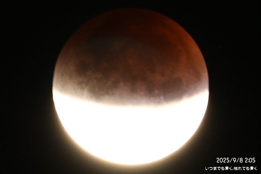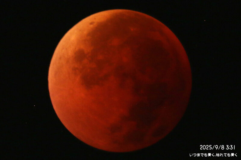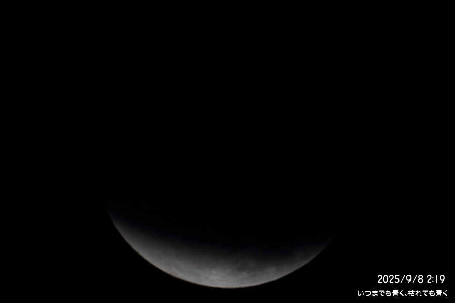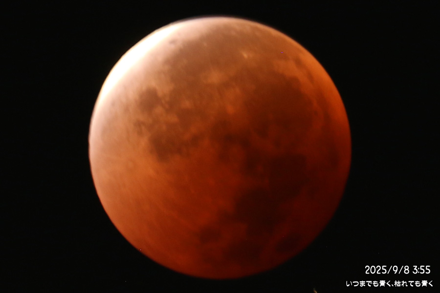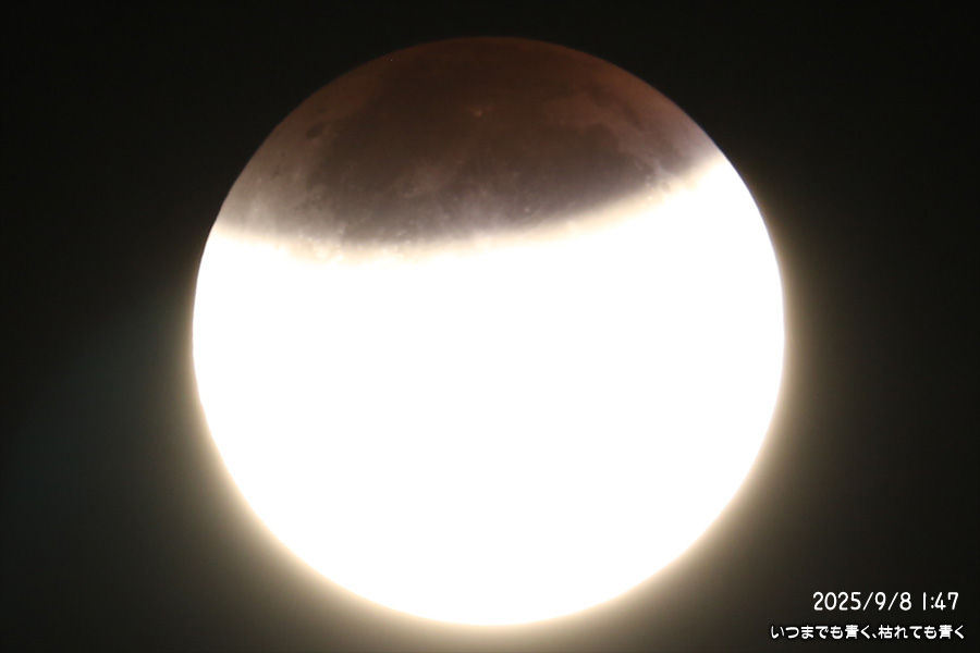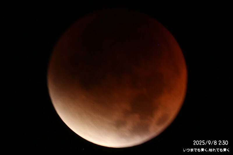 皆既月食 2025年9月8日 その他の写真 2025年9月8日(月) 23:592025年9月18日(木) 23:14 9月8日の皆既月食の写真。動く月を望遠でアップで捉えたので、月の位置の変化は撮影した写真を合成する必要がありますが、とりあえずアップの写真をまとめました。月蝕の赤い月は光量がほとんど無いので長時間露光でボケた感じになっているのが残念でした。ざらついても感度をあげてシャッタースピードを優先したほうが良かったかもしれません。