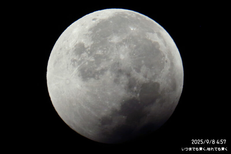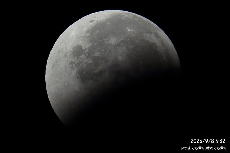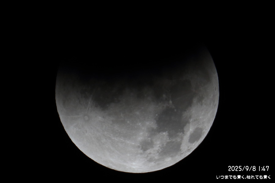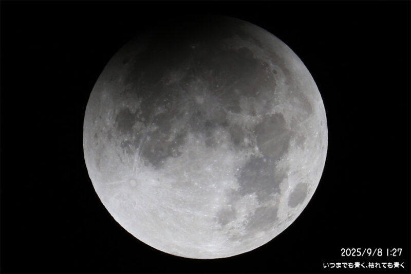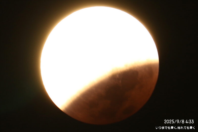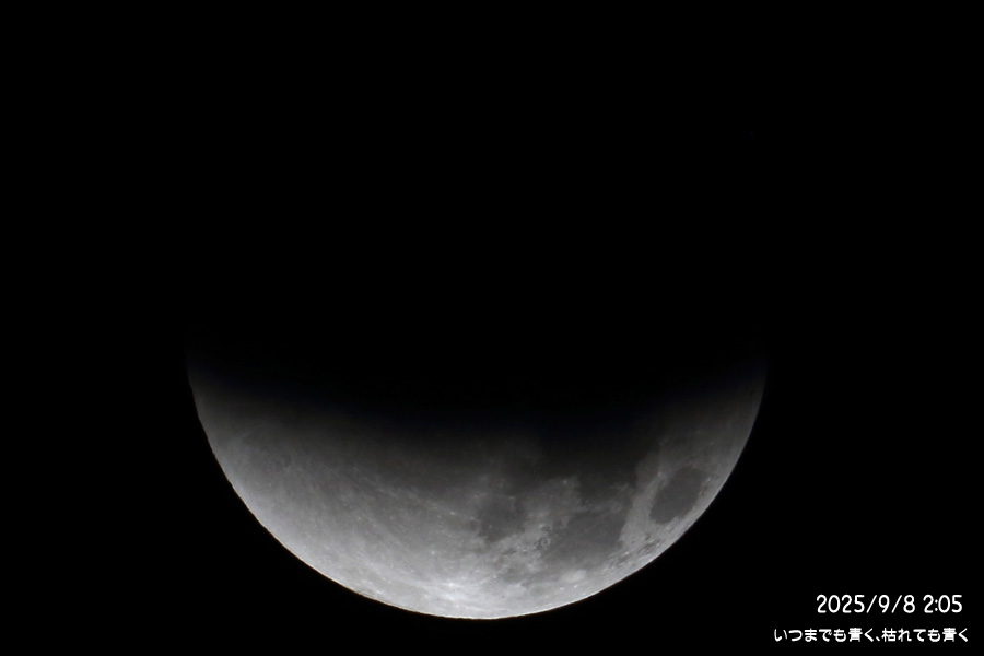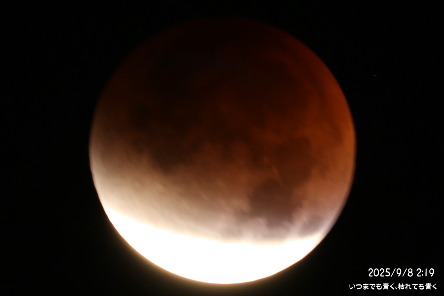 皆既月食 2025年9月8日 その他の写真 2025年9月8日(月) 23:592025年9月18日(木) 23:14 9月8日の皆既月食の写真。動く月を望遠でアップで捉えたので、月の位置の変化は撮影した写真を合成する必要がありますが、とりあえずアップの写真をまとめました。月蝕の赤い月は光量がほとんど無いので長時間露光でボケた感じになっているのが残念でした。ざらついても感度をあげてシャッタースピードを優先したほうが良かったかもしれません。