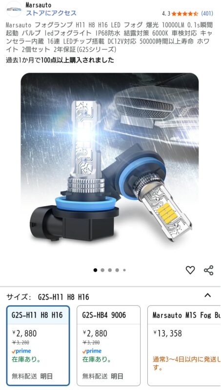 今日はミラ・ココアの13年目の車検でした。が、フォグランプのバルブ切れで車検は延期となりました。もちろん、その場でバルブ交換してもらえば車検完了となったのですが、片側のバルブ代と交換工賃よりも安い金額でLEDバルブ2個セットがネットで買えるので、自分で調達してあらためてということになりました。帰宅後、さっそくAmazonで注文、400円クーポンとポイントを使って2,472円で購入できました。Amazonは配送が不安なのでできる限り使わないようにしていますが、今回はヨドバシに良い在庫品がなかったので仕方なくAmazonで買いました。明日到着なので、交換方法をネットで確認しておこうと思います。