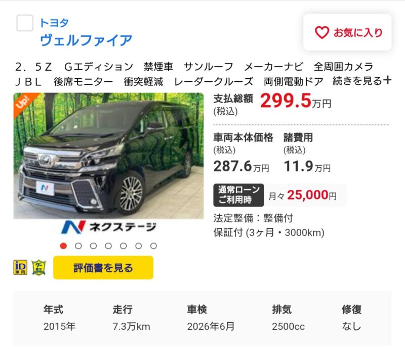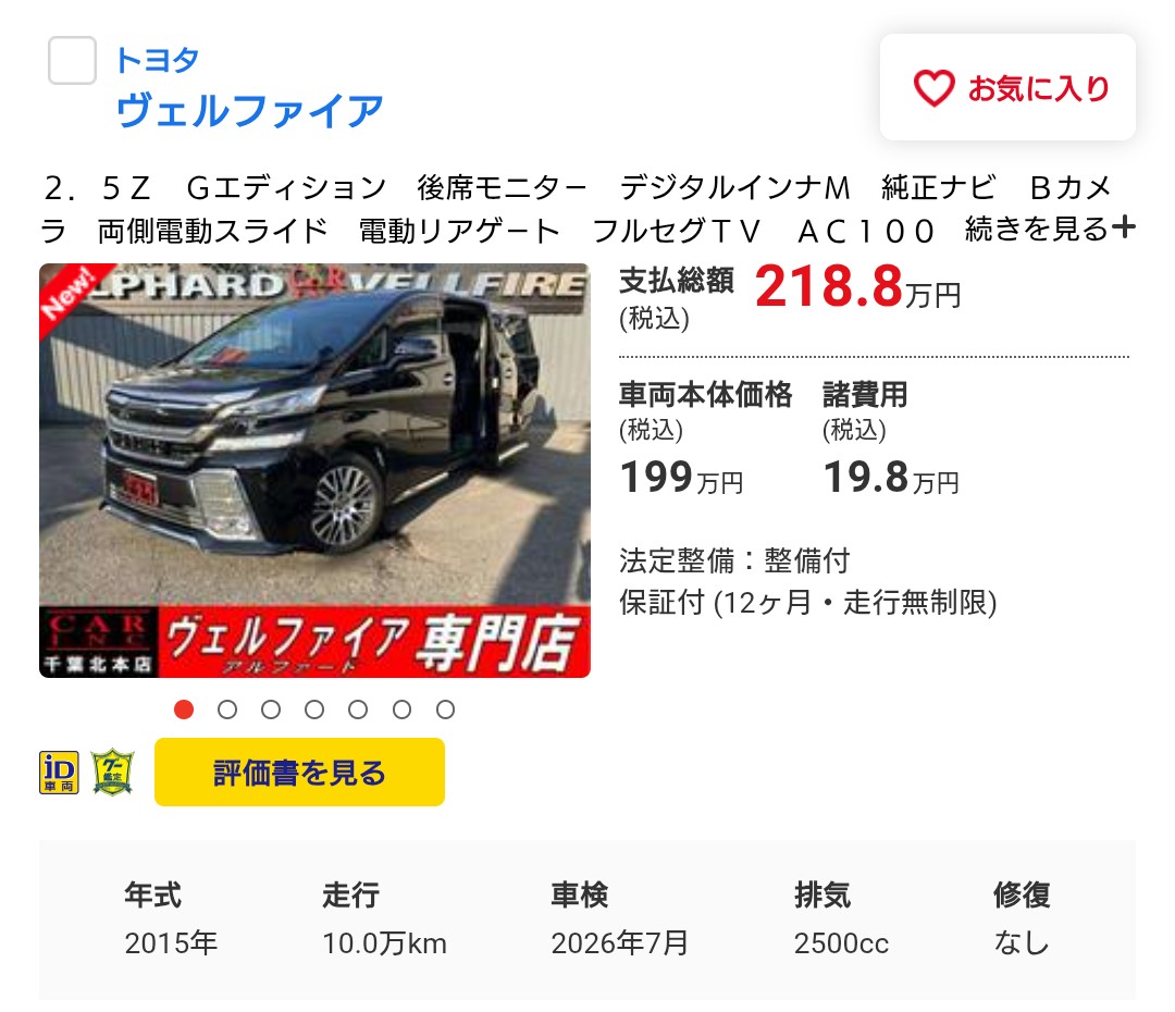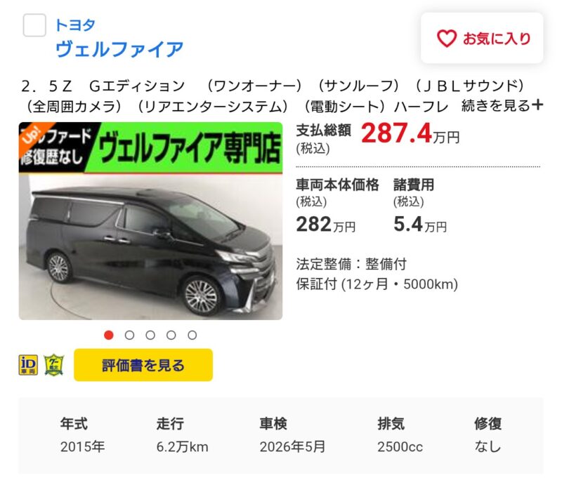 2015年式ヴェルファイアの市場価格 クルマの話 2025年9月25日(木) 10:492025年9月27日(土) 1:31 2015年式「ヴェルファイア2.5Z Gエディション」の中古車価格、まだこんなにしているのですね。買い取りだと100万円ちょっとくらいでしょうか。私のヴェルファイアはサンルーフも無くフル装備車ではないので、2番目のクルマの価格に近いのでしょうね。もちろん、気に入っているし買えば200万円もするクルマを、100万円程度の買取価格で手放すつもりは全くありませんが。