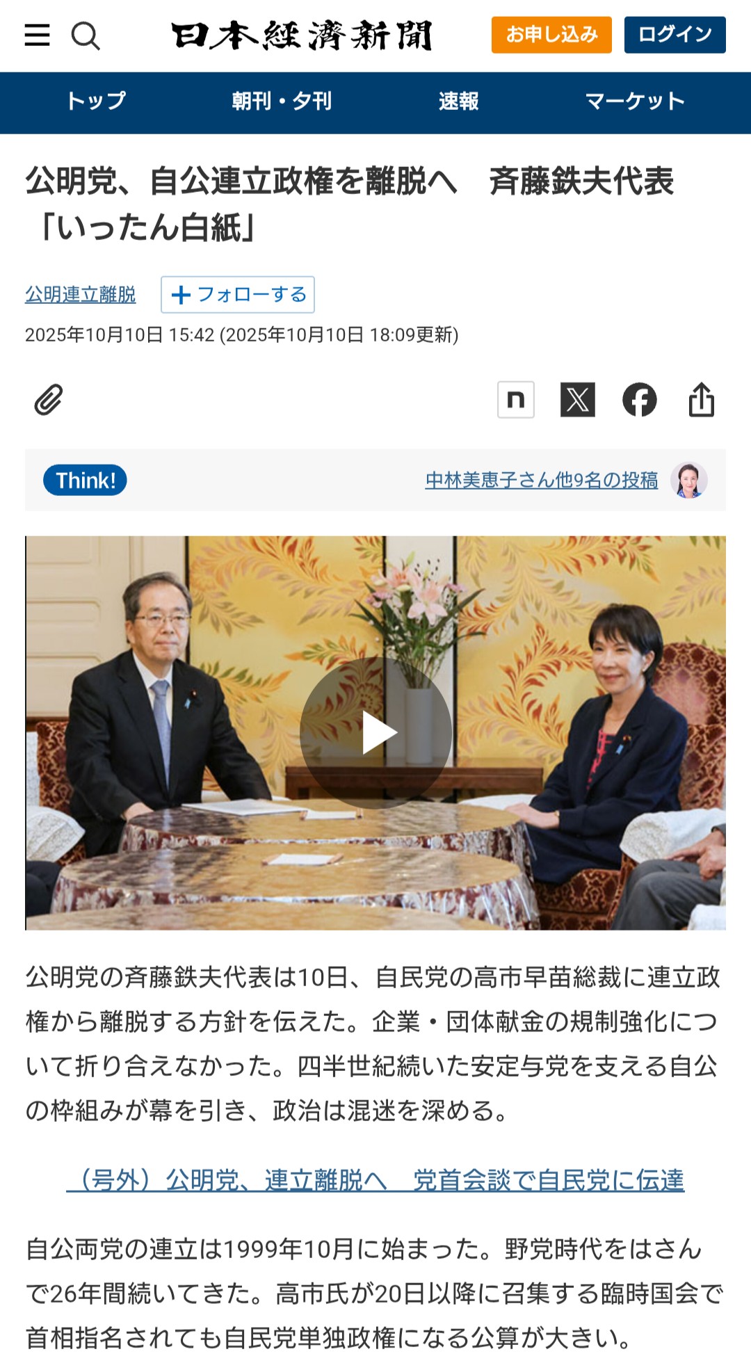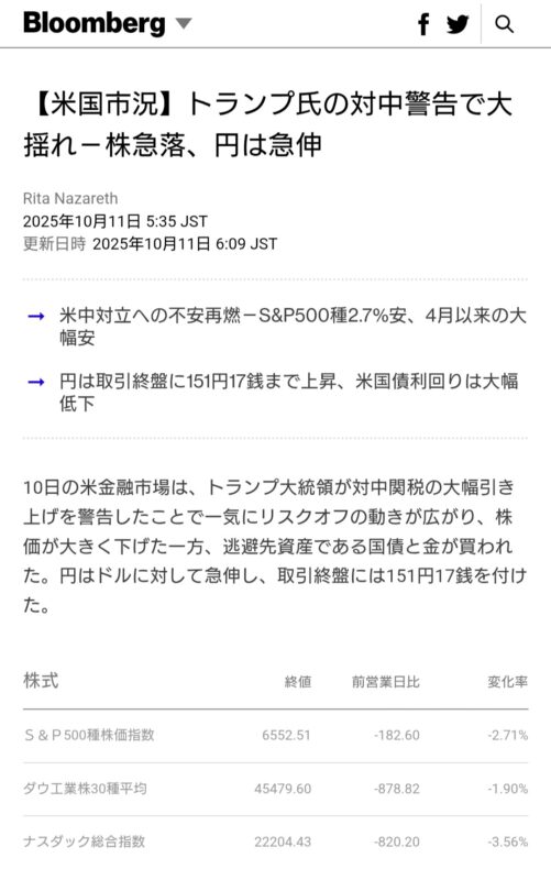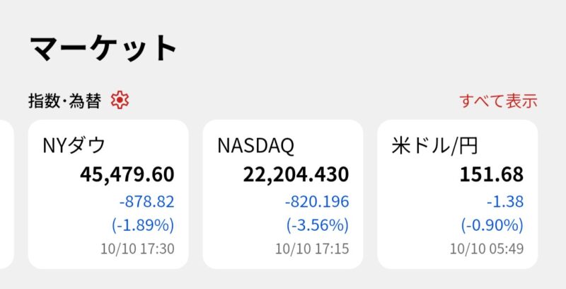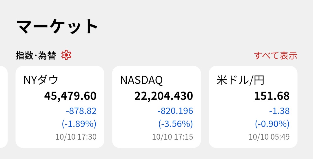 公明党政権離脱とトランプ発言で… お金の話 2025年10月11日(土) 16:57 ここ数日の好景気が昨日で一転。公明党の政権離脱による高市政権に暗雲、トランプの対中発言で、米国市場は急落(寝る前はプラスだったのに)、為替は円高へ。ここ数日で200円安全圏にまで上がって安泰だと思っていたファンドの評価額が、このドタバタで今月の分配金200円がまた綱渡りとなりました。14日が決算日なので、13日夜の米国市場と為替が持ち直してくれることを祈るしかありません。