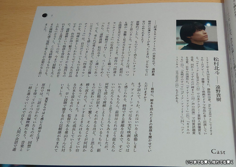 水曜日の夕方、実写版の「秒速5センチメートル」を観てきました。アニメの3つの個別の心揺れ動くだけの静かな話を、話を広げて感動的なひとつの物語にうまく作り上げたものだと感心する映画でした。結末はアニメ版とは異なってハッピーエンドの形かなと思ってしまいましたが、そこはアニメ版と同じくちょっと切ない結末でした。しかし、アニメ版と違って貴樹が過去の思いに一区切りをつけて前向きに生きる過程と心の変化が丁寧に感動的に描かれていました。詳しい感想や映画情報に興味のある場合は下記ホームページをご覧ください。