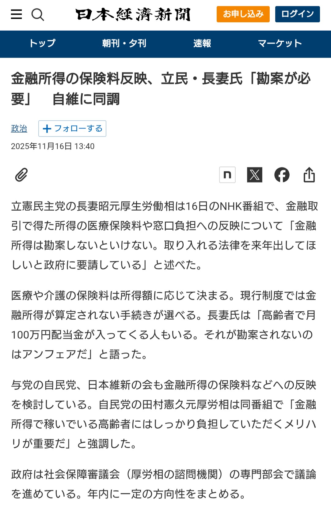 金融所得は、リスクを負ったうえでの結果的な所得であり損もすることがあるものなのだ。自己責任でやっていることに、儲けているからと安易に考えることに怒りを感じる。銀行預金の利息や国債の利息も金融所得だから、そういう人も影響する。こういうことを言うならば、政治資金にも課税して医療保険料等へ反映してからにしてほしいと思う。久しぶりに心から腹立たしく感じる動きだ。ただ、金融所得の所得税が医療費控除等の所得控除対象になって、金融所得の損益を他の所得で相殺できるのならば、メリットはあるかも知れない。やるなら、他の所得と同等に扱ってくれる仕組みにしてほしい。