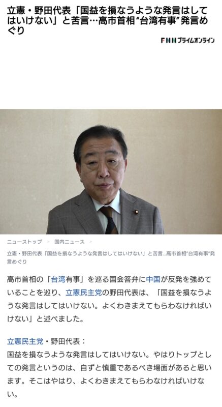 立憲民主党の岡田氏が執拗に執拗に質問して高市総理から引き出した発言に対して、立憲民主党代表の野田氏は高市総理に国益を損なう発言をしてはいけないと言う。だったらそんな執拗な質問して国益を損なう発言を引き出そうとした岡田氏を非難しろ、と私は思う。ホントにあの岡田氏の質問は酷かった。過去の言動をとらえて何のための質問だったのか全く理解できない。他の立憲民主党議員の質問もみんな酷いから、そういうレベルの党なんでしょう。それと、高市総理の発言は至極当然のことで、国益を損なう発言だとは思わない。彼の国も最初は発言に対して反発していなかった。「汚い首を斬ってやる」なんて発言したために、それを守るために振り上げた拳を引っ込められなくなっているだけ。