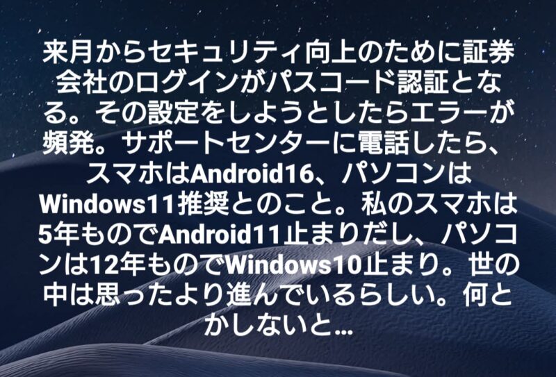 世の中は思ったより進んでいるらしい 日記/出来事 2025年11月25日(火) 14:362025年12月3日(水) 10:15 来月からセキュリティ向上のために証券会社のログインがパスキー認証となる。その設定をしようとしたらエラーが頻発。サポートセンターに電話したら、スマホはAndroid16、パソコンはWindows11推奨とのこと。私のスマホは5年ものでAndroid11止まりだし、パソコンは12年ものでWindows10止まり。世の中は思ったより進んでいるらしい。何とかしないと…