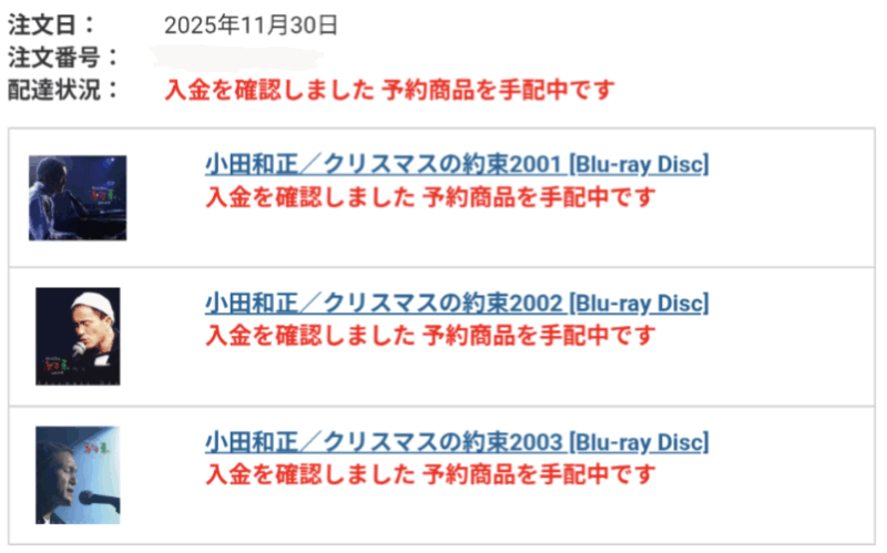 昨夜、小田和正「クリスマスの約束」のBlu-ray3枚を予約しました。当時はアナログ波だったので録画したものとは段違いの画質だし、「クリスマスの約束」の録画は2003年からしかしていませんので、2001年、2002年のはより楽しみです。予約は、Amazonなどの特典は要らないので1枚定価6,600円が5,610円のところで購入予約をしました。ポイントを使って3枚で16,830円。10%のポイント付与があるので実質15,147円となります。ささやかな自分から自分へのクリスマスプレゼントです。発売まで、録画した「クリスマスの約束」を見直して待とうかなと思ってDVD化したものを引っ張り出してきました。