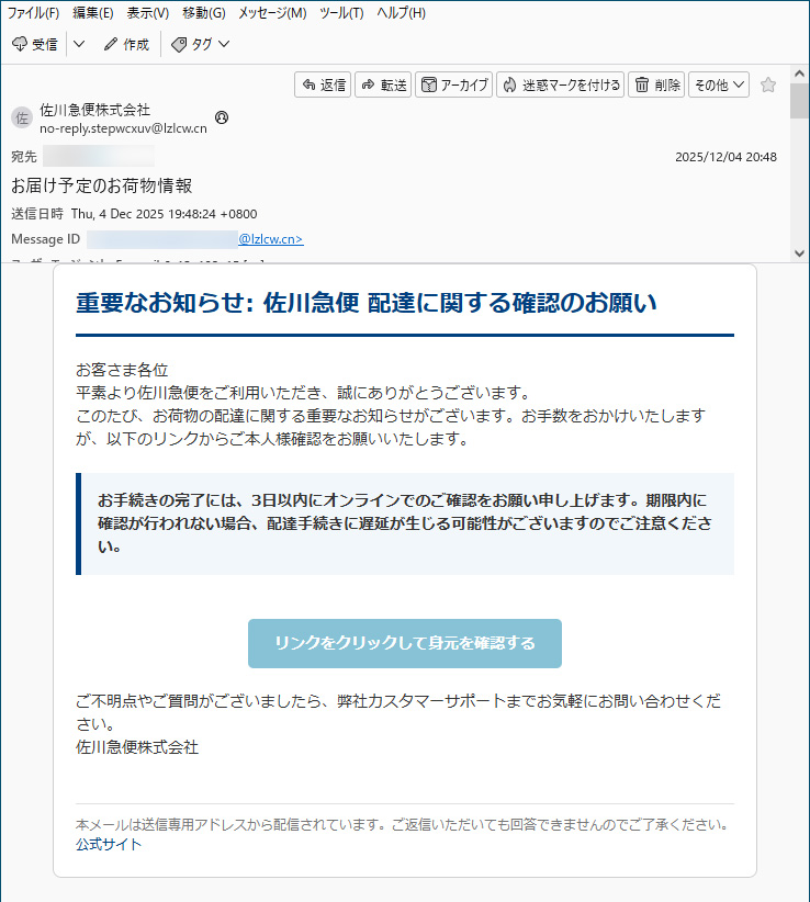 危ない危ない・・・ 日記/出来事 2025年12月4日(木) 23:592025年12月5日(金) 0:55 明日佐川急便の配達予定があったので、ついクリックしてしまうところでした。絶妙なタイミングでこんなメールが来ると、いつもの警戒感が緩んで本物と信じてしまいそうでした。普段ならば相手にもしないメールなんですが。危ない危ない・・・