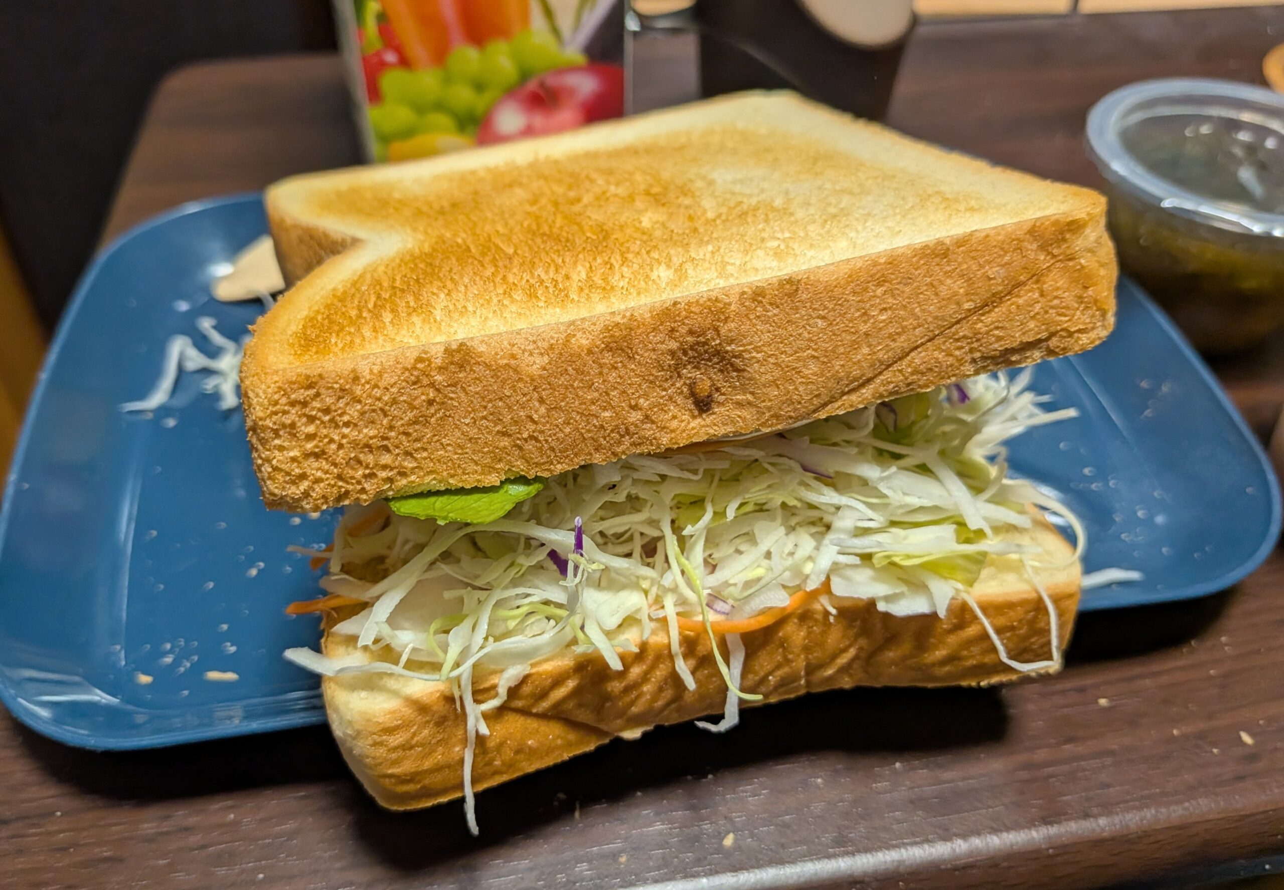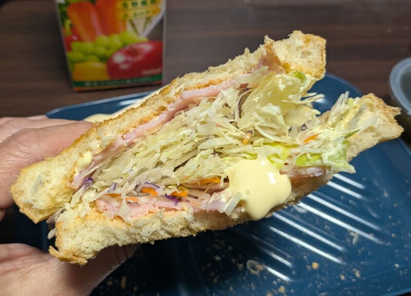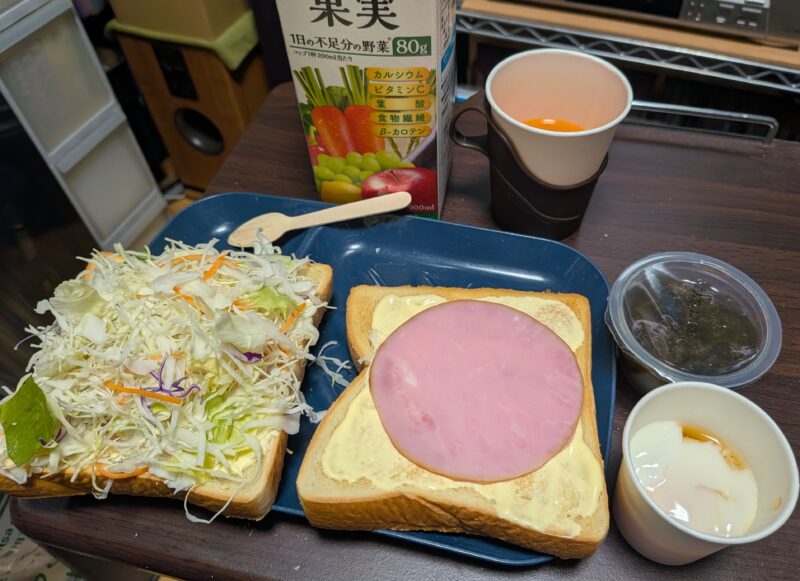 いくら早く寝ても、夜中は一度も目覚めることなく7:30のアラームもやり過ごし、いつも朝ごはんは9時を過ぎてしまうこの頃。朝6時に起きて朝の散歩をしていた日々が嘘のようです。夜中にトイレで起きることなく、朝早くに目が覚めることもなく、まだ若いのだと良いように思うようにしています。起きてから準備する今のお気に入りの朝ごはんは、トーストに低カロリーマヨネーズを塗ってハムを乗せて、間に目一杯のカット野菜を挟んだサンドイッチ。それと野菜ジュースと温泉たまごともずく。気になっていた血痰は昨日も全く無し。やっぱり胃カメラで傷つけられていて1週間くらいで治ったと考えるのが妥当なのかも。今日も楽しく元気で過ごしましょう。
