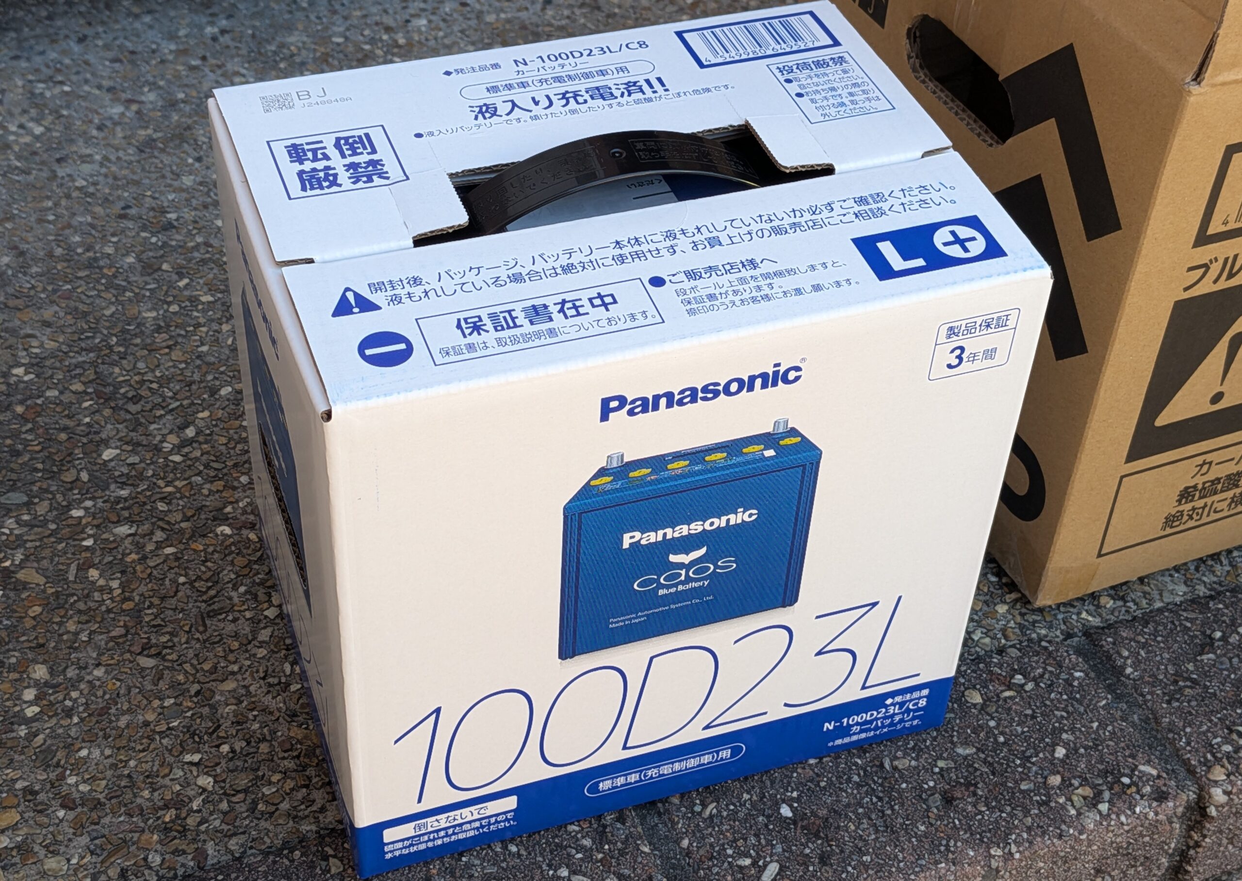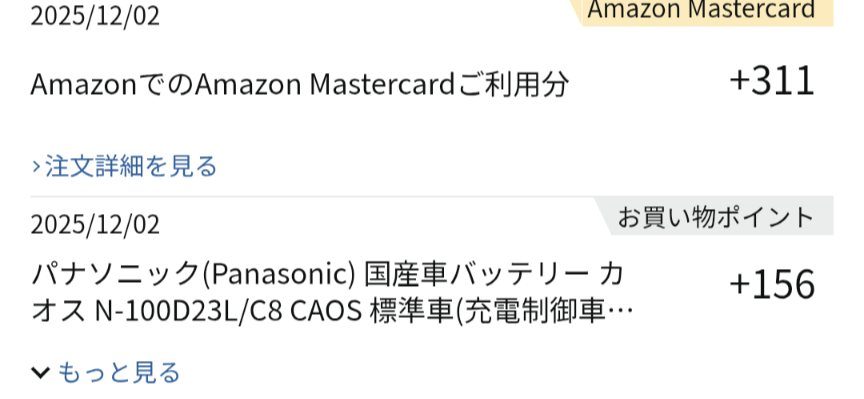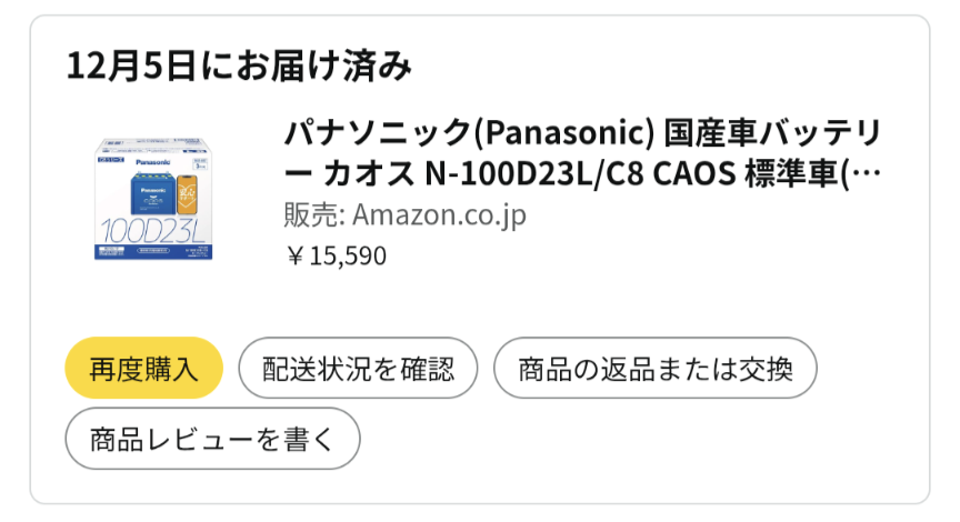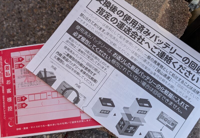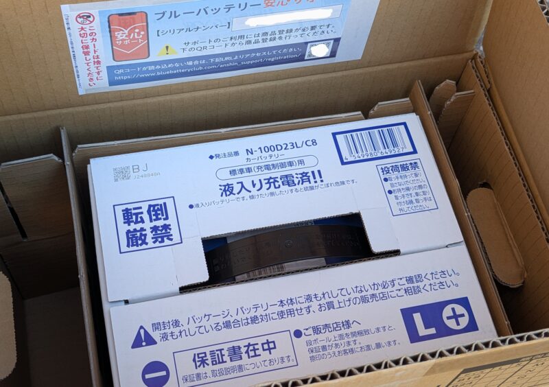 ブラックフライデーで買ったヴェルファイアのバッテリー(100D23L/C8)が昨日届きました。半年前の点検で「充電容量が少なくなってきているので、そろそろ交換を考えたほうがいいと思います」と言われたのですが、表面上はまだ問題はなかったし夏季だったので放置していました。しかし、過去は3年半でエンジンがかからないという症状が出て交換しているので、前回の交換時期を考えると現時点で3年半となり本格的な冬になる前の今、交換しておいたほうが良いかなと思ってブラックフライデーに合わせて購入しました。交換はもう少ししてからおこなう予定ですが、液漏れなどの初期不具合が無いかどうかを今日チェックしました。製造ロットも2025年10月22日と問題なさそうです。安心サポート、3年保証、使用済みバッテリー無料回収もちゃんと付いていました。価格は15,590円、付与ポイントは467ポイントでした。ヴェルファイアは2015年7月購入後、2019年1月(3年半、100D23L/C6、9,980円)、2022年6月(3年半、100D23L/C7、13,499円)、今回2025年12月(3年半、100D23L/C8、15,590円)とPanasonicの同じバッテリーを一番安いところで買っていますが、交換のたびに数千円高くなってきています。次回は20,000円超えもあり得るかも知れません。