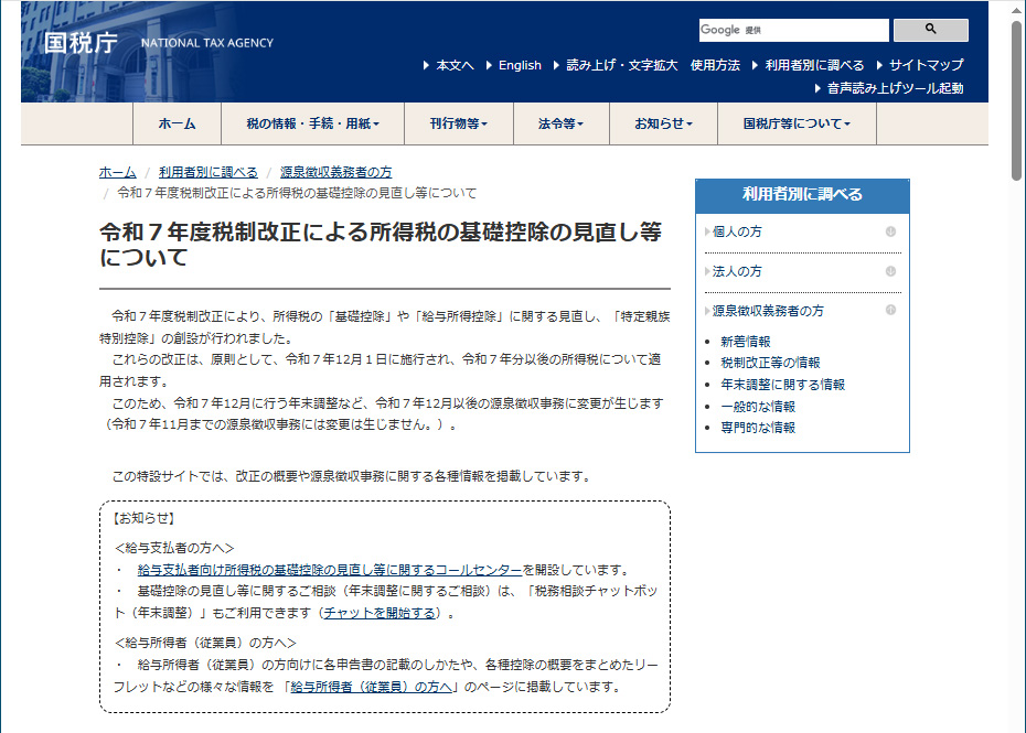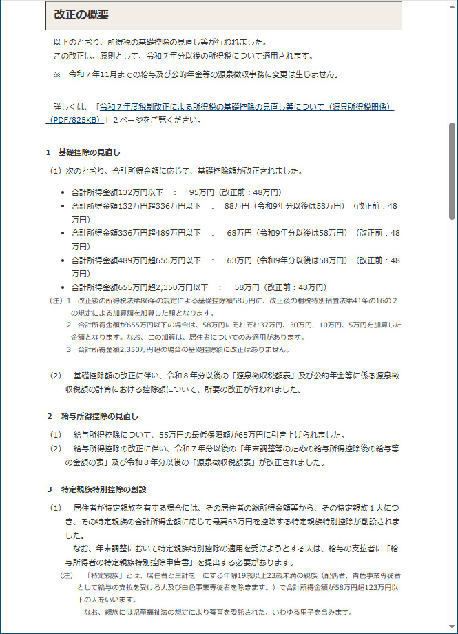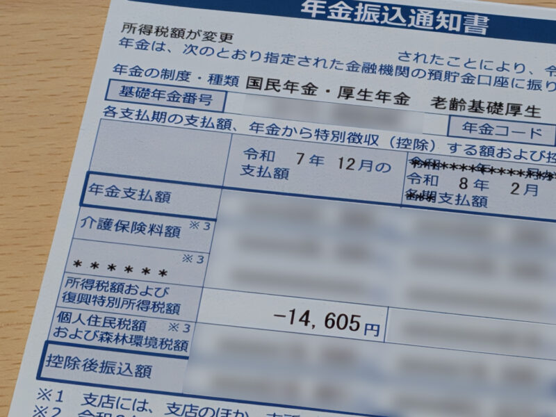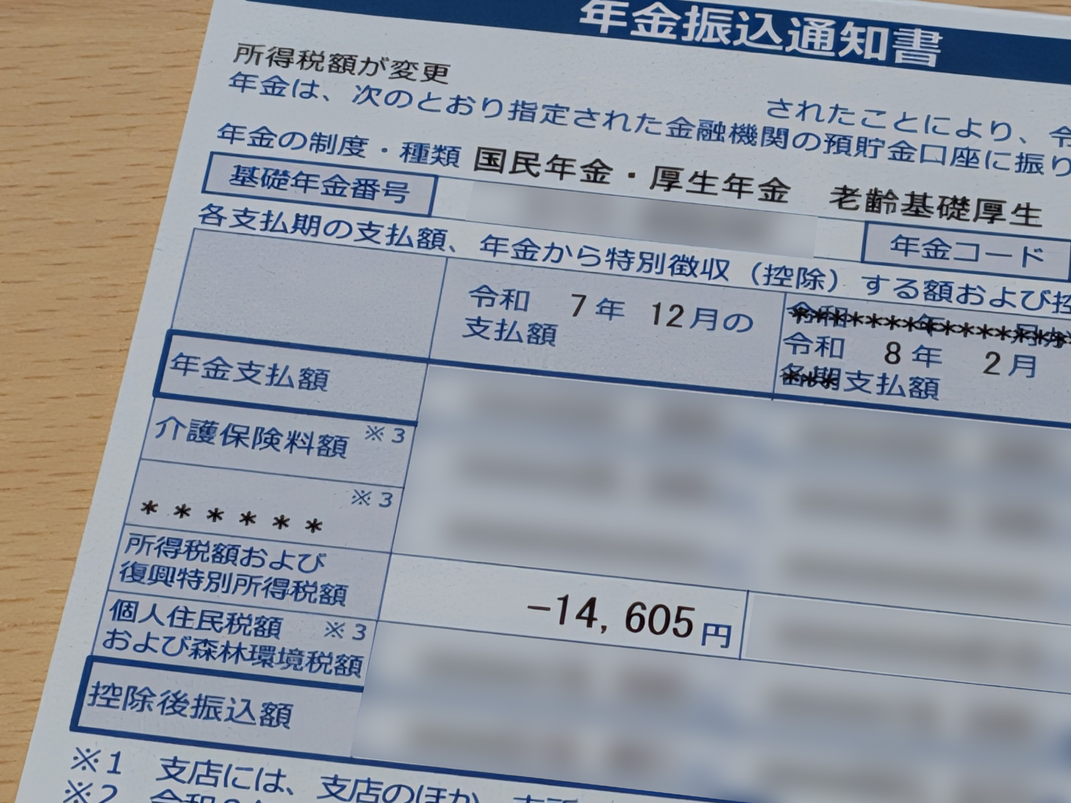 令和7年度税制改正による所得税基礎控除の見直し等 お金の話 2025年12月9日(火) 12:15 昨日、年金振込通知書が届きました。中を見てみると、なんと所得税がマイナス、つまり戻ってきます。年金年額は決まっているので、こんな調整はいつもは無いはずなのにと思って調べてみたら、今年3月の「年収の壁」問題での改正だったのですね。基礎控除額の引き上げにより、私のような年金生活者の税負担も多少は軽くなるようです。来年からの所得税も10月以前の4分の1以下になっていて助かります。