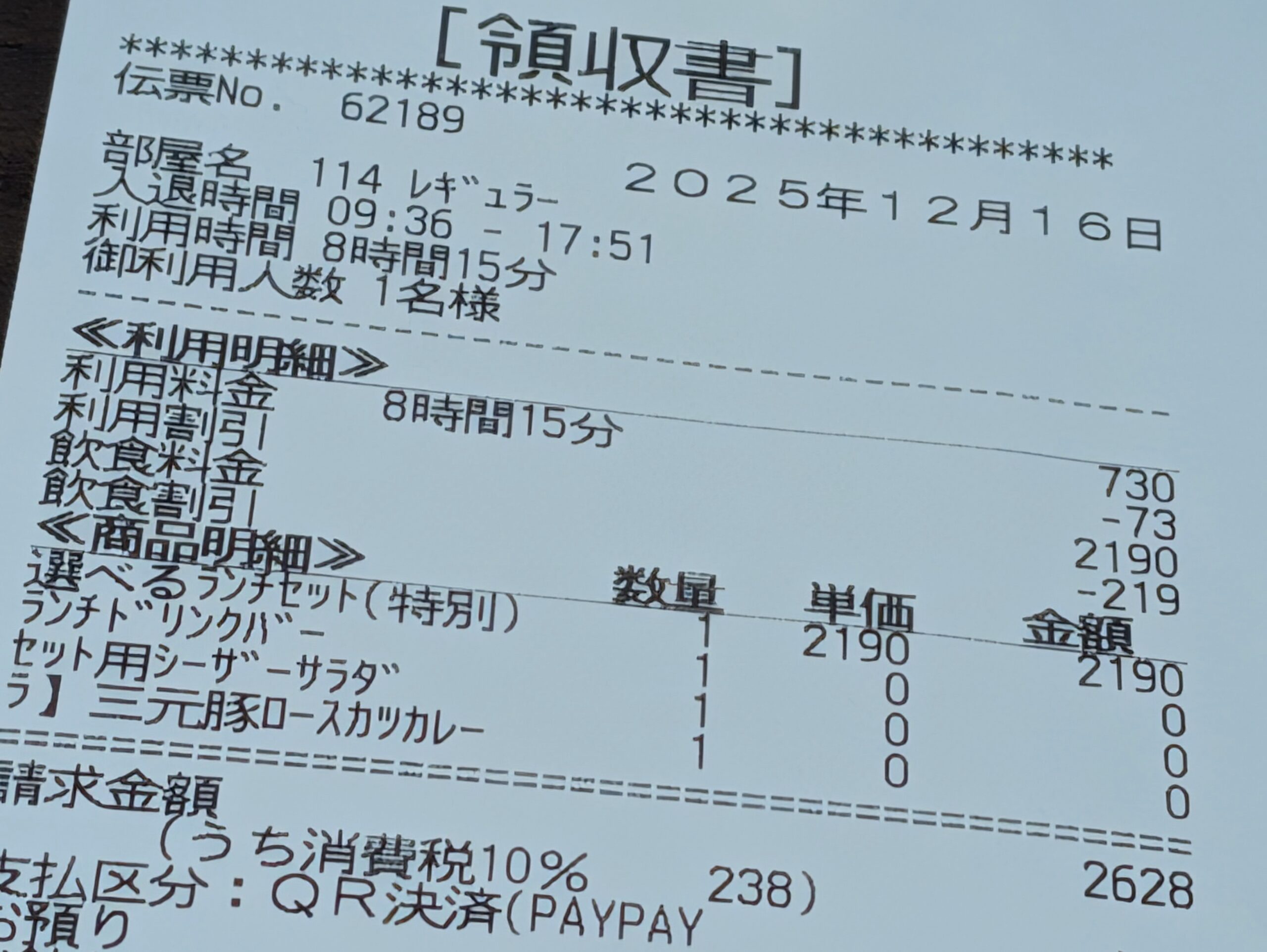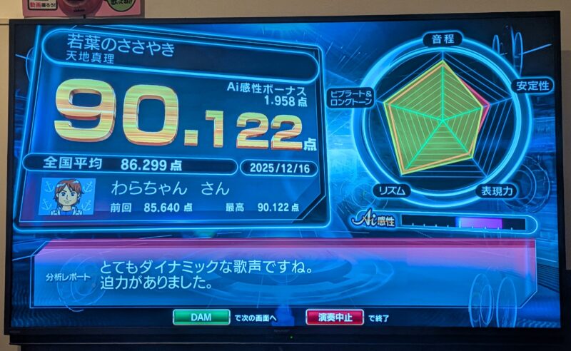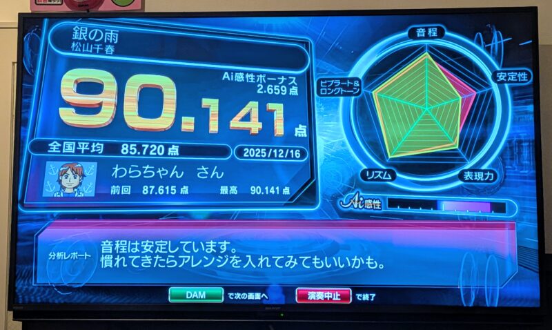久しぶりの一人カラオケを楽しんできました。朝9:36から夕方17:51まで8時間ちょっとですが、声が出るようになってきたと思ったらもう時間という感じです。フリータイムの8時間はあっという間で、さらに5時間くらいは延ばしてほしいものです。何曲歌ったかはこれからDAMサイトを見て確認しますが、その中で90点台は2曲だけ。でもまぁ、歌って楽しんで発散することが目的なので、そういう意味では十分楽しかったです。8時間以上歌ってカツカレー食べて2,628円(年末特別価格)、映画に比べるとコスパのいい楽しみ方です。ハプニングとしては、カラオケ店のトイレで財布を拾いました。もちろんちゃんとフロントに届けましたが、落としたという感じではなくて置いたという形跡だったので、時間も経っているようなのに持ち主は気づかないものなのかと不思議でした。