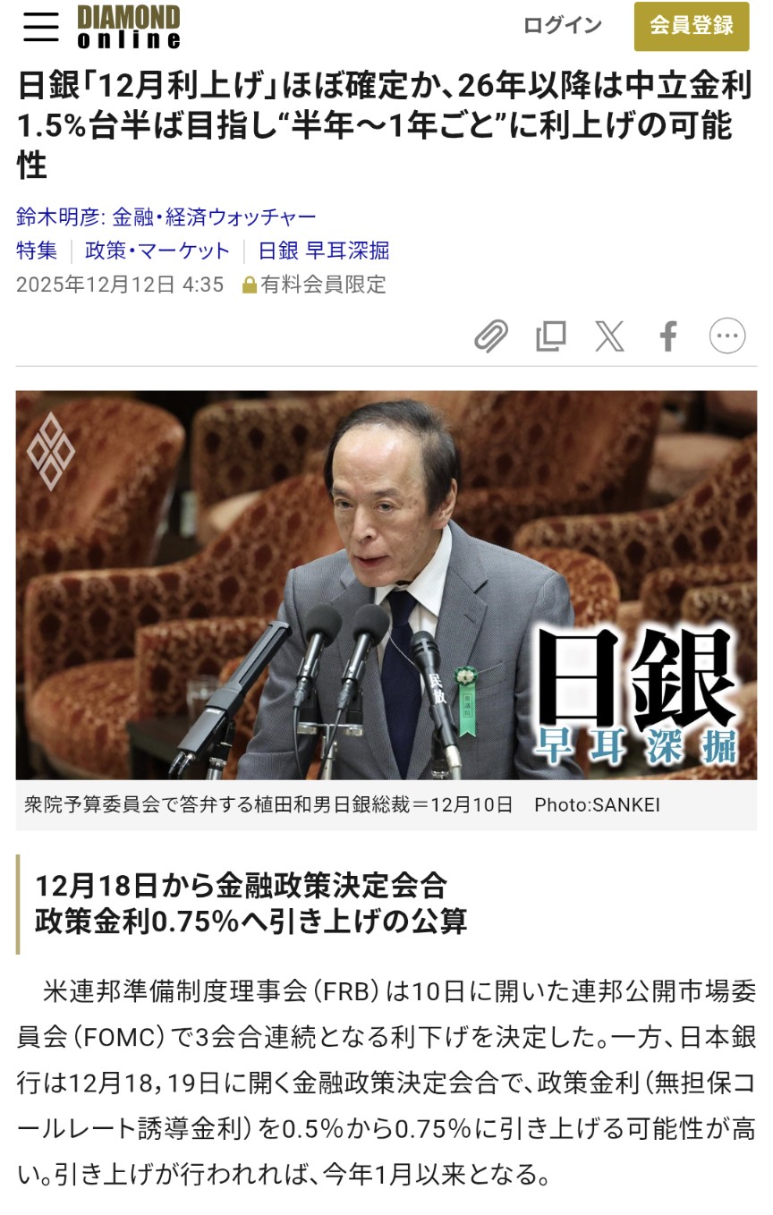 やっとという感じではありますが12月利上げと今後の利上げ継続確定のようです。変動金利のローンの人にも影響ありますが、一番気になるのは為替への影響ですねぇ。利上げは円安対策なので円高に振れるのは当たり前ですが、米国市場への投資やドル建て保険等を持っている私は円高に向かうのはちょっと困ります。物価がさがるという大きなメリットがあればまだ許容できますが、円高に大きく振れないと上がった物価は簡単に下がらないだろうし、円高に振れると個人的なデメリットが大きくなりますし。株式市場もこれをどう受け止めるのか心配ですし、さて今後どうなっていくのでしょうか。