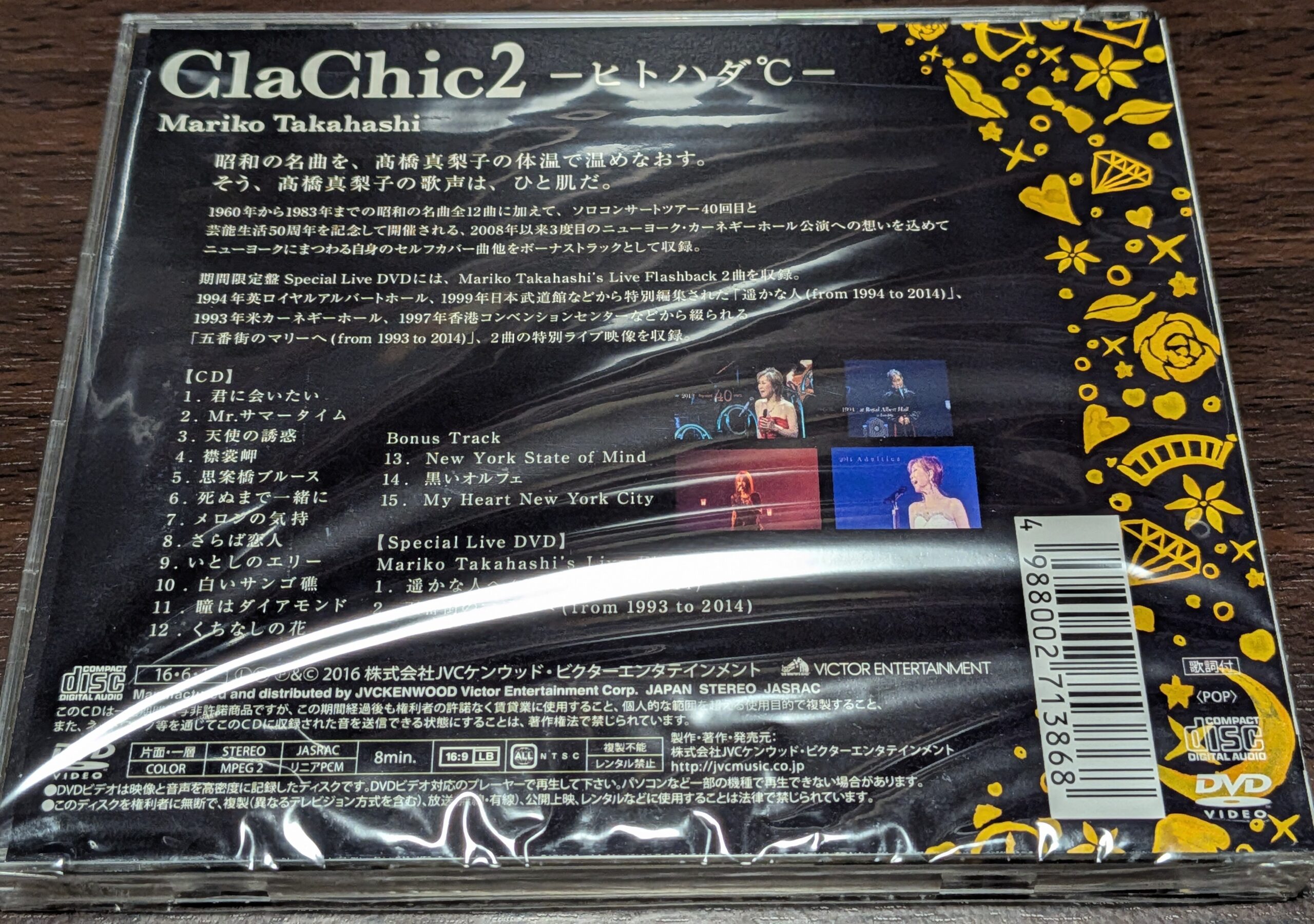 高橋真梨子「ClaChic」 音楽全般 2025年12月18日(木) 16:392025年12月19日(金) 7:43 先日、CDラックを移動するためにCDを取り出した時に、封も開けていないCDを見つけてしまいました。高橋真梨子のコンサートに行った2016年10月に買ったとAmazonの注文履歴にありました。今日は部屋の片付けのあと、のんびりと聴いています。高橋真梨子のカバーアルバムですが、好きな懐かしい歌を高橋真梨子の声で聴くのもとても新鮮で良いものです。
