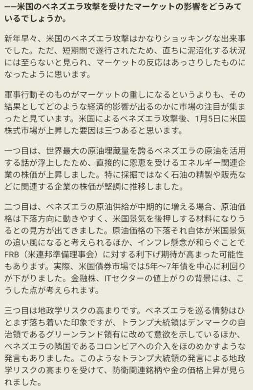 年初の株式市場 お金の話 2026年1月7日(水) 8:30 年明けてから日本株式市場も米国株式市場も好調です。世界情勢に対する不安と株式市場への影響(投資家の反応)は違うのですね。勉強になりますが、こんな市場の先読みなど私には到底できません。