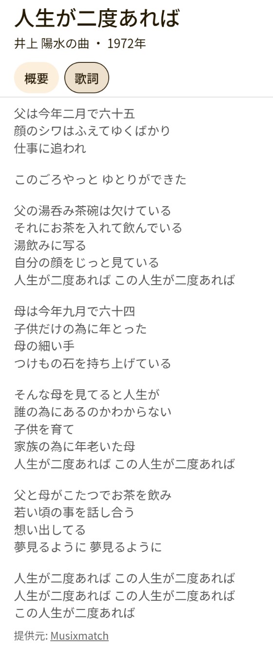 今月は68歳となる誕生月、ついこの歌を思い出してしまいました。この歌を聴いていた頃は、65歳の父親と64歳の母親は、子どもから見るとこんなふうに老いて見えるものなのだろうなと疑問も持たず思っていましたが、その年齢を超えた自分を見ると、こんなには老いてはいないぞと思ってしまうし、たぶん娘たちも親をこんなふうには見ていないと思いたいです。しかし、人生が二度あればと思うことはあります。娘たちが幼い頃の接し方、本当の自分の扱い方、などなど。なお、仕事に絡むことは、能力不足での恥や後悔はたくさんありますが、もう一度やり直したいとはまったく思いません。