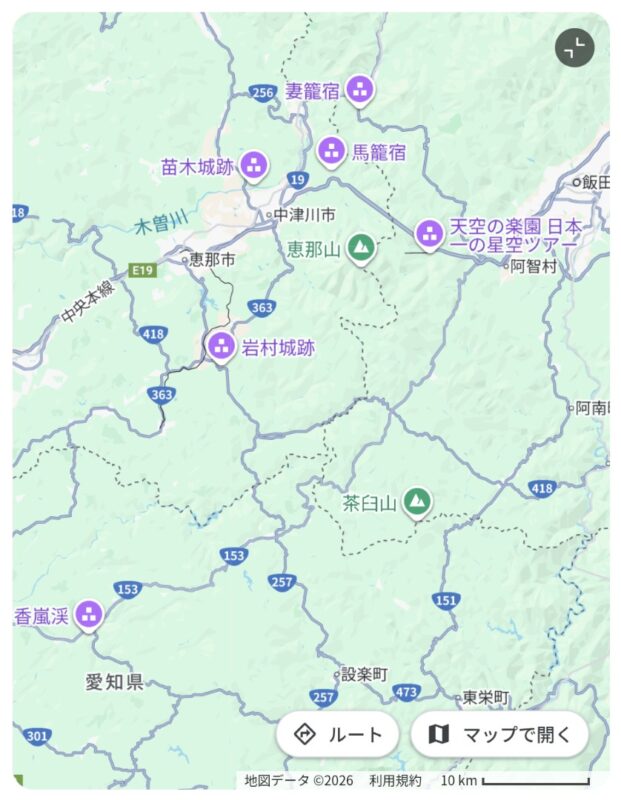 日本一の星空の村 徒然の思い 2026年1月19日(月) 9:40 今、テレビで紹介されていた長野県の日本一の星空で有名な阿智村。長野県と聞くと遠くて簡単には行けないと思ってしまいますが、地図を見ると、私のよく行く香嵐渓や大井平公園や茶臼山や岩村城などから一般道で少し足を伸ばせば行けるところです。だからといってすぐに行こうというわけではありませんが。