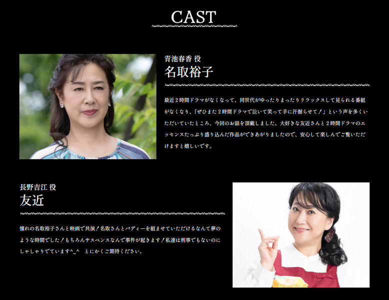 2時間サスペンスドラマの常連俳優が出ていますし、2時間サスペンスの定番でお約束といえるようなシーン(崖や崖や崖・・・)や流れが取り入れられていて、エンディングには、竹内まりやの「シングル・アゲイン」が流れ、「火曜サスペンス劇場」のエンディングを彷彿させらるところはとても懐かしくて良かったです。ストーリー自体は2時間サスペンスドラマ水準だとは思いますし、気持ちのすれ違い的なちょっと切ない事件ではありました。父親である橘花靖幸(国広富之)が、子供のために厳しくしたことを後悔する場面がありましたが、そこは自分の姿と重なって身につまされました。ただ、謎解きは凝ったものではなかったですし、そもそもの設定(特に青池春香と長野吉江)が安易すぎるところに全体として物足りなさを感じました。2時間サスペンスドラマの雰囲気やそれっぽさを無理に入れ込んだりというところに重点を置きすぎているように感じました。そんな感じだったので正直ちょっと退屈で、知らぬ間に瞼が落ちて一瞬意識が飛んでいたというような鑑賞になってしまいました。期待が高かったわりに、ちょっと残念な感じの映画でした。