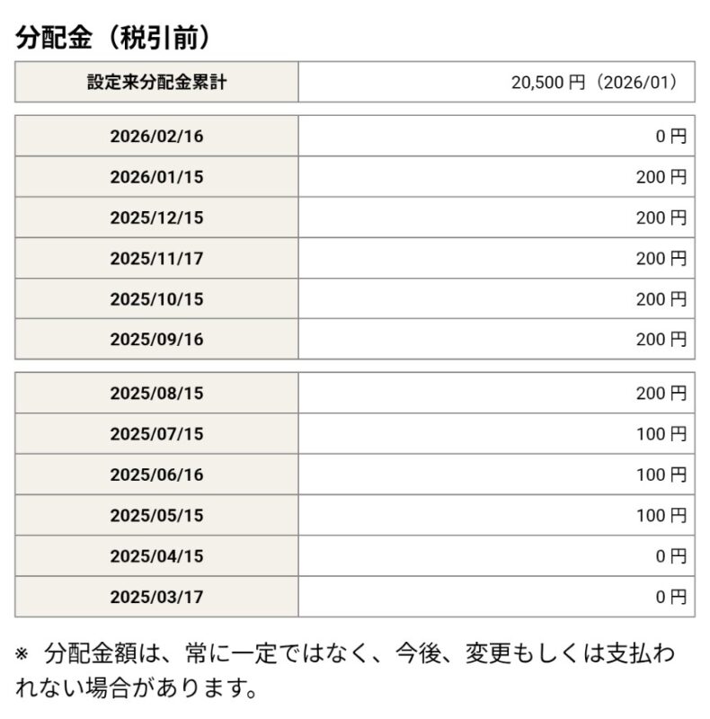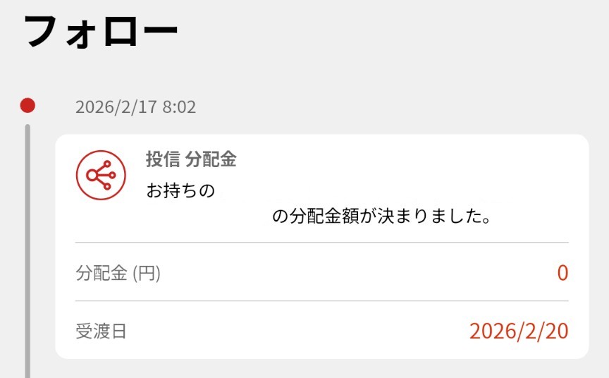 今月の分配金_202602その1 お金の話 2026年2月17日(火) 9:33 今月の毎月分配型ファンドの分配金は無配となりました。米国のハイテク企業などの株価低迷による結果です。こういうこともあるのが投資です。また戻ることを期待してこういう時はどっしりと構えていることにします。