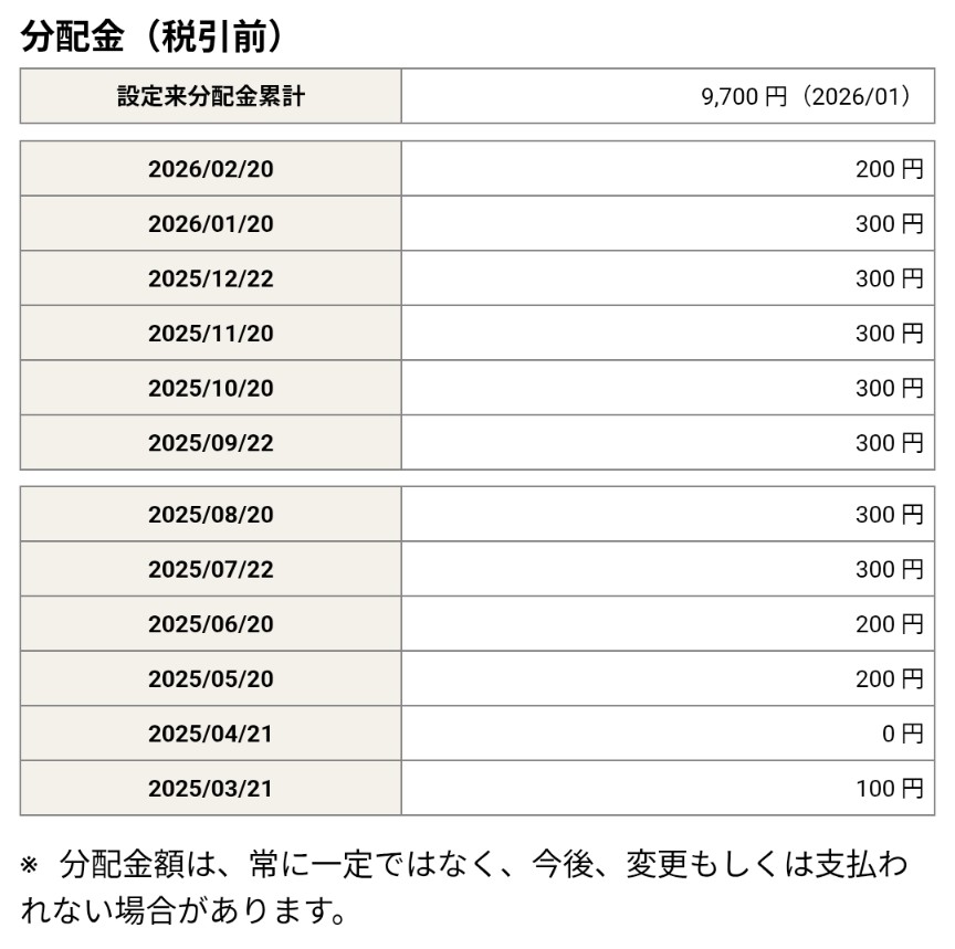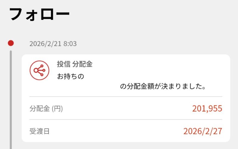 今月の分配金_202602その2 お金の話 2026年2月21日(土) 9:45 今月増資した毎月分配型ファンドの今月の分配金が決まりました。今までメインだったファンドは無配だったので、これは本当に助かります。私にとっては取得コストから特別分配金になりますので厳密には利益ではありませんが、家計的にはとても助かります。来月はもっと上向きになってほしいものです。