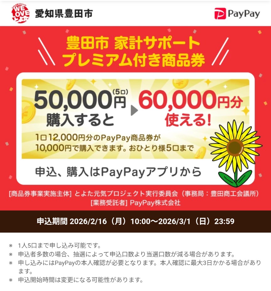 わが住む街のおこめ券相当なのがこれなのでしょうか。物価高騰による家計負担軽減という目的なのでそうなのかもしれません。PayPay商品券というのも使いやすいのでとても良いと思いますが、PayPayアプリのみの発行なので、PayPayアプリを使っていなくて本人確認まで進むというのはかなり敷居が高い気がします。特にPayPay決済を使っていないお年寄りには特にそう思います。それに、希望者のみであり希望者でも予算の範囲内での交付なので、全員が希望通り手にすることができないようでもあります。また、申込単位は1家庭あたりということではなく1人あたりなので、家族全員が条件に該当すれば申し込めます。なので、このやり方がいいのかどうかは意見のわかれるところです。しかし、キャッシュレス化は年齢関係なく対応していく事が社会の効率化になるので、最初から拒否反応を持たずにこれをきっかけにキャッシュレスに挑戦するのも必要なことのように思います。私はさっそく申し込みましたが、奥さんも娘たちもPayPayアプリを使っているので、彼女たちはどうするのでしょうか。