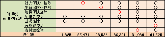 せっかく税金計算のエクセルシートを作ったので、年金の所得税の源泉徴収額は控除額がどこまで考慮されているのか試算してみました。計算してみると、基礎控除と配偶者控除を考慮した所得税額が源泉徴収額に一番近く還付額は1,325円となります。それに社会保険料(介護保険料や国民健康保険税の支払額)を加えると還付額は25,471円、さらに生命保険料の支払い額を加えると還付額は28,534円、さらに地震保険料の支払いを加えると還付額は30,321円、さらに寄付金控除(ふるさと納税額)を加えると還付額は31,036円、さらに医療費控除(10万円以上の医療費)を加えると還付額は64,525円となります。これでわかったのは、誰でも必ず支払わされている社会保険料(介護保険料と国民健康保険税)が源泉徴収額には考慮されていないということになります。つまり、年末調整など無い年金生活者は、確定申告しないと所得税を多く支払ったままということになります。
