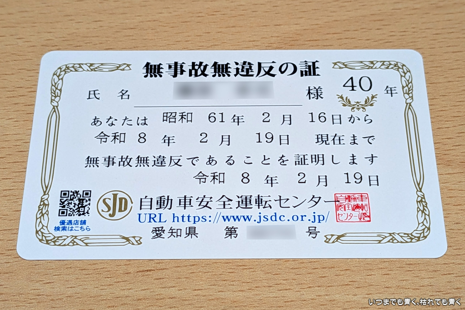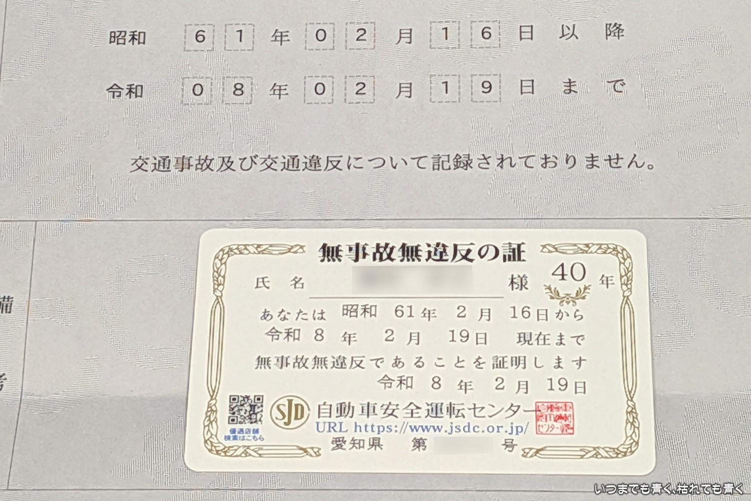 無事故無違反の証 40年 クルマの話 2026年2月24日(火) 17:06 今日、申し込んでいた「無事故無違反の証 40年」が届きました。1986年2月16日から2026年2月19日の証明となります。この間、8台の車に乗り、その期間の走行距離は概算で約35万km、年にして約8,750km、月にして約730kmとなります。ルールを守って走っていれば難しいことではありませんし、運転する限り気を緩めることではありませんが、私の中のひとつの区切りにはしたいと思います。