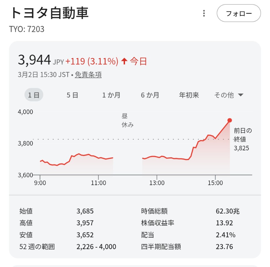 どうしてトヨタ株が? お金の話 2026年3月2日(月) 23:29 アメリカとイスラエルのせい(イランも)で日経平均は午前中に一時1000円以上も下げていて、今日も目減りかと覚悟していましたが、どういうわけかトヨタ自動車が14時以降急騰で昨日比プラス119円で目減り回避。なぜなのかと調べたら、豊田自動織機へのTOB価格引き上げが好感とのことらしい。ま、流行りのAIが言ってるだけなのでホントかどうかは知りませんが。