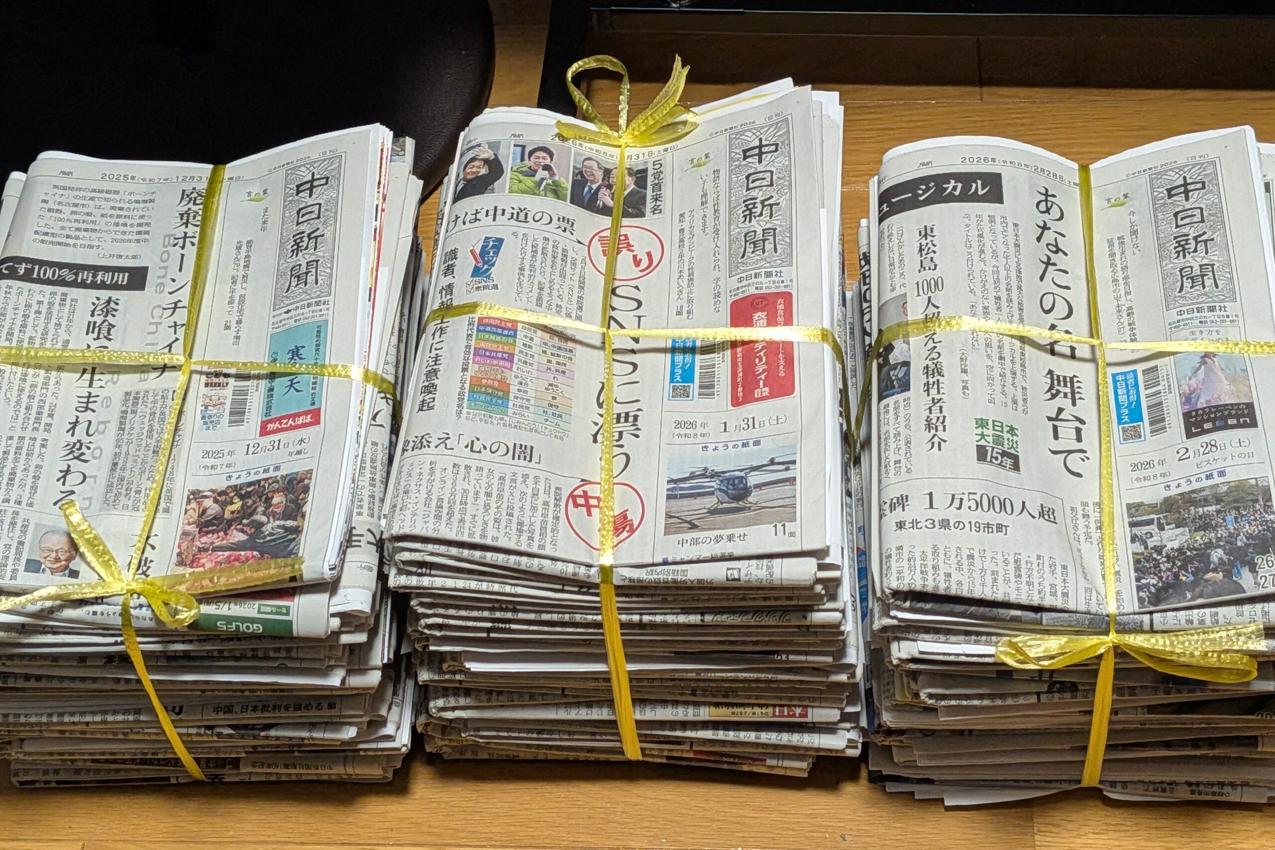 新聞とペットボトルと段ボール 日記/出来事 2026年3月8日(日) 14:41 新聞を整理して、ペットボトルを洗って潰して、不要な段ボールをまとめて、ヴェルファイアに積み込んでリサイクルステーションへ持って行く。体を動かして何かをして物事などがひとつ解決すると、1日の充実感が違います。今日は長女も手伝ってくれて「今日は風が強くて寒い」と言っていましたが、私は外でも体がポカポカして寒いなんて全く感じず良い気分でした。ただ、「お父さんはそんなこと言って病後なのにすぐに無理するからまたぶり返すんだよ」と心配していたので気をつけたいと思います。