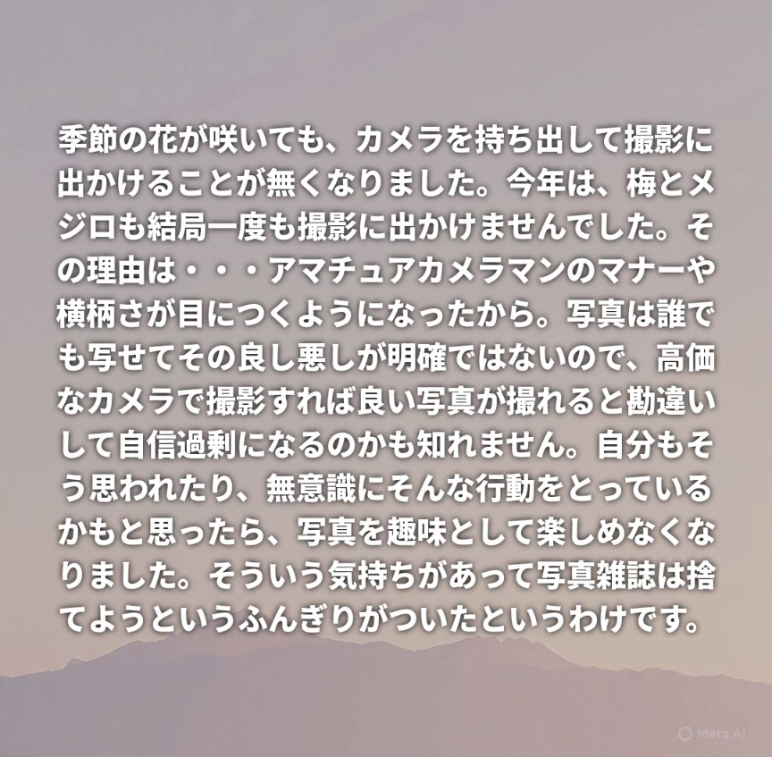 季節の花が咲いても、カメラを持ち出して撮影に出かけることが無くなりました。今年は、梅とメジロも結局一度も撮影に出かけませんでした。その理由は・・・アマチュアカメラマンのマナーや横柄さが目につくようになったから。写真は誰でも写せてその良し悪しが明確ではないので、高価なカメラで撮影すれば良い写真が撮れると勘違いして自信過剰になるのかも知れません。自分もそう思われたり、無意識にそんな行動をとっているかもと思ったら、写真を趣味として楽しめなくなりました。そういう気持ちがあって写真雑誌は捨てようというふんぎりがついたというわけです。